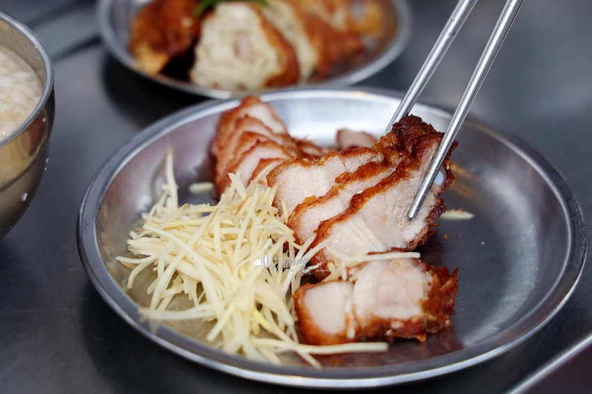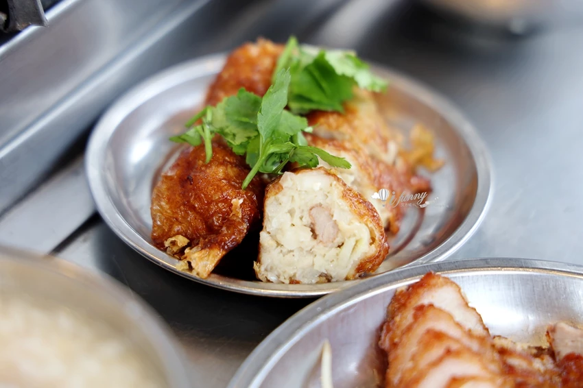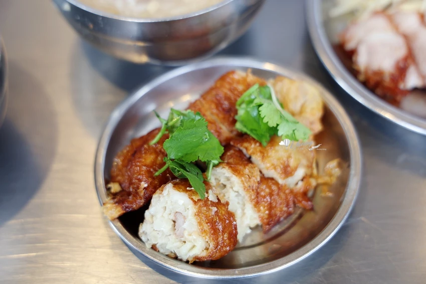 這裡的雞卷($60)是老饕必點的招牌菜,現場就能看到工作人員手工現包的過程。內餡使用魚漿、醃漬過的豬里肌條,並加入了大量的「馬薺」(荸薺)。腐皮經過油炸後呈現金黃酥脆的誘人色澤,一口咬下,荸薺帶來的清脆多汁口感完美平衡了炸物的油膩感,搭配鹹粥中的油蔥酥香氣,是經典不敗的黃金組合。