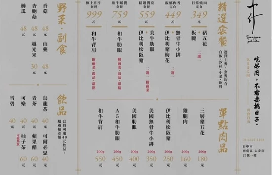 【十什燒肉】位於臺中市西屯區大安街,鄰近新光三越和大遠百百貨,看到全白的店門就是了,開車可停放於附近的收費停車場。