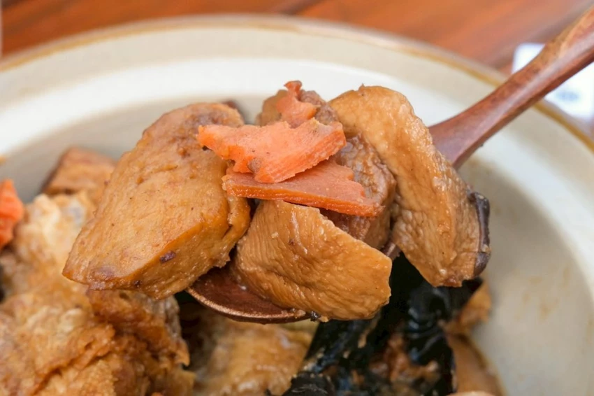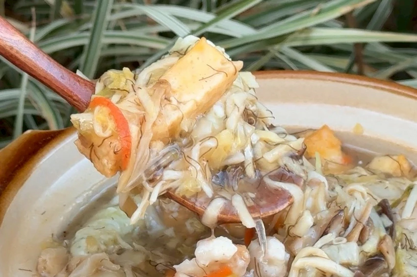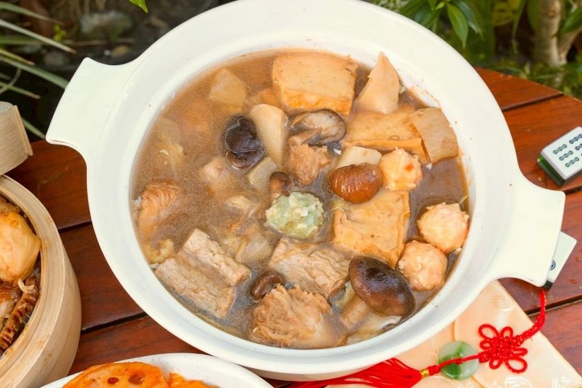 ▼超澎湃的一品山海佛跳牆,給料霸氣不手軟,可以吃到白菜、白蘿蔔、芋頭、筍、猴頭菇、香菇、栗子、全素丸子、全素野菜揚、小麥蛋白,湯頭濃郁鮮美讓人停不下來。