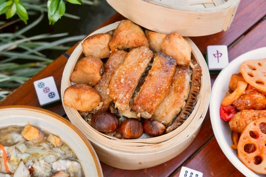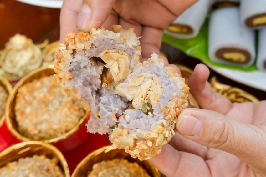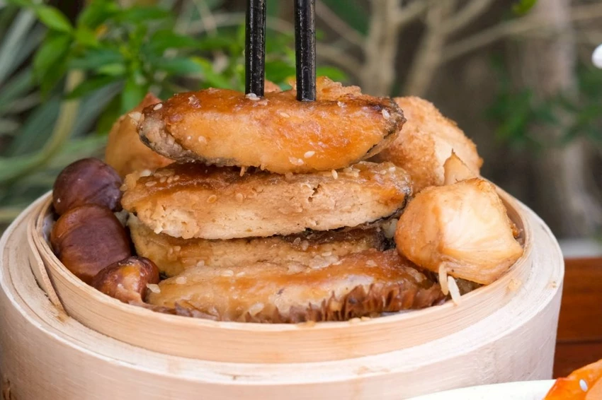 ▼餡料滿滿滿的鹽之花杏仁芋泥鴨,是我最愛的一道料理,外層杏仁粒酥脆好咬,內餡有著滿滿芋泥+素鴨肉,每一口都讓人感到大滿足。