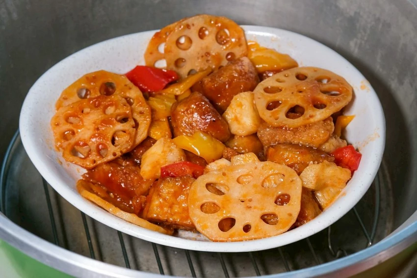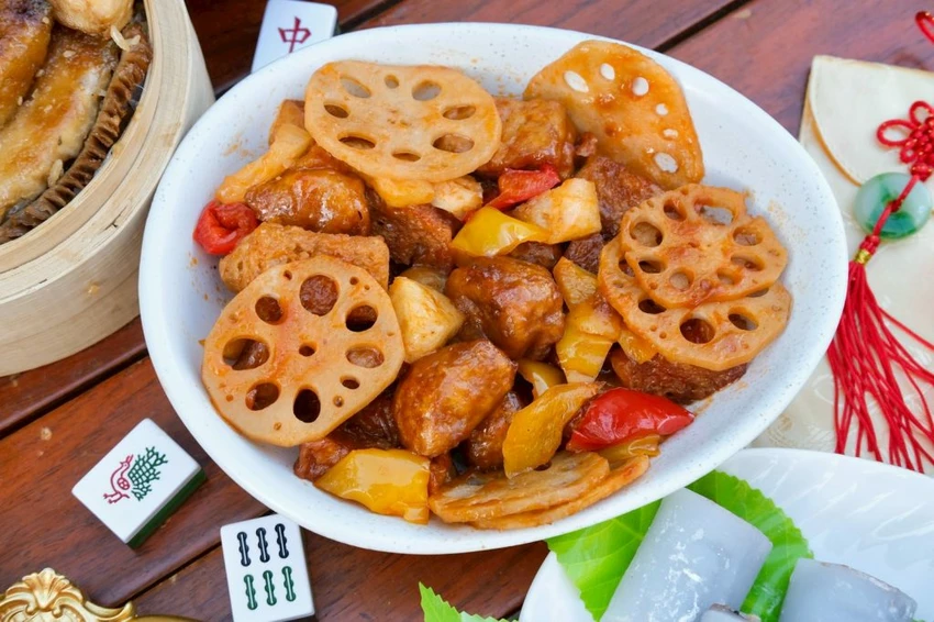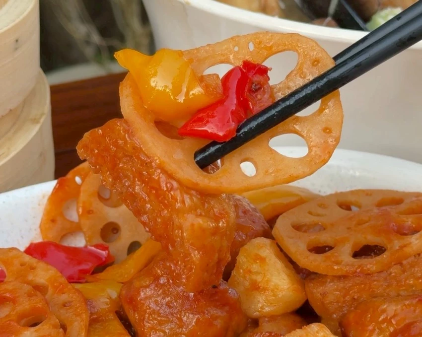 ▼讓人口水直流的琥珀糖醋咕咾肉,如果閉眼睛吃,真的以為在吃一般的糖醋咕咾肉欸,將烤麩與豆腱裹上琥珀色糖醋醬,咬起來外酥內嫩,口感讓人著迷,酸甜開胃尬上彩椒、蓮藕、鳳梨、多汁爽脆層次豐富!