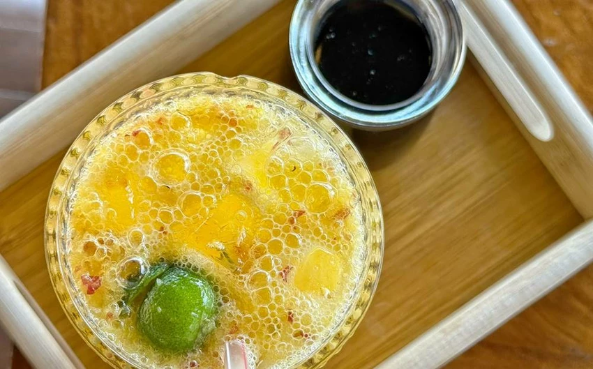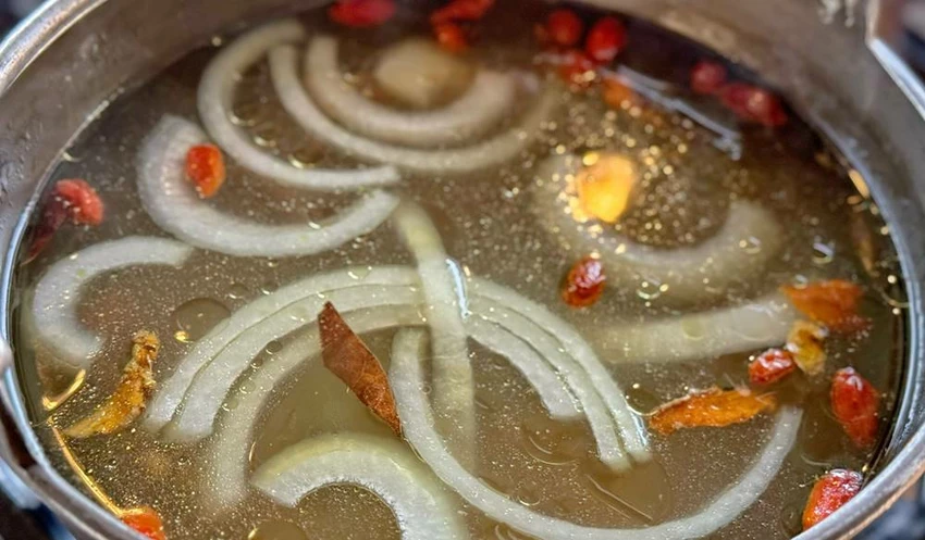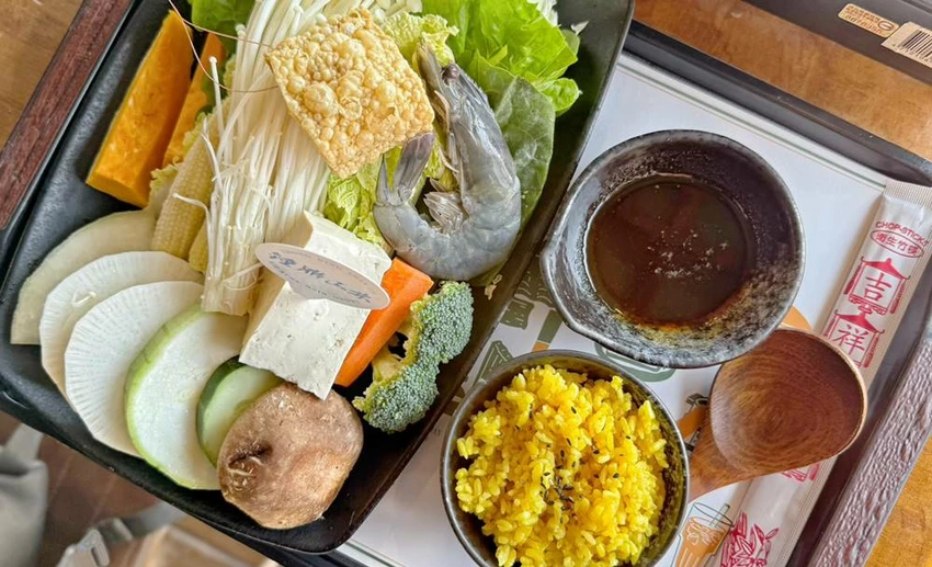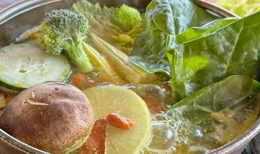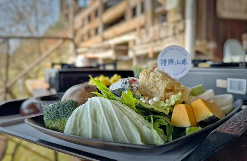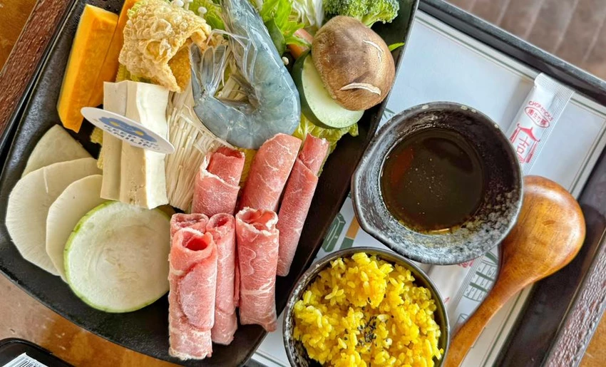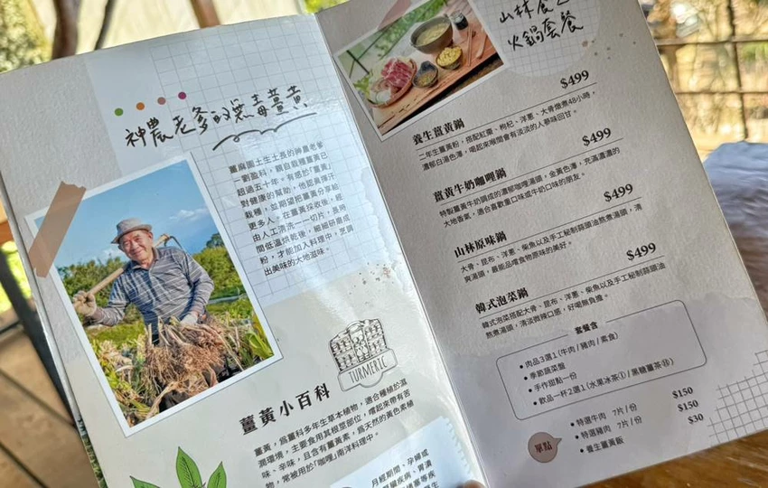 另一道招牌料理是「養生薑黃火鍋」,店家強調使用親手種植的薑黃熬製湯底。金黃色的湯頭帶有淡淡的咖哩香氣,口感溫潤順口,不會有辛辣感。搭配鮮嫩的牛肉片與豐富的季節時蔬,將食材放入鍋中涮煮,能吸附滿滿的薑黃香氣,既養生又美味,非常適合喜愛清爽口味的饕客。