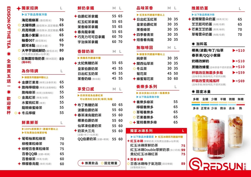 紅太陽的飲品選擇極其多樣化,除了深受大眾喜愛的經典原茶與奶酪系列外,最令手搖控驚艷的是其多款「獨創招牌」,像是視覺與味覺雙重享受的「紅玉冰磚」、吸睛度爆表的「太陽特調、月亮特調」,及創意十足的「海尼根綠茶」,都是店內不容錯過的靈魂飲品