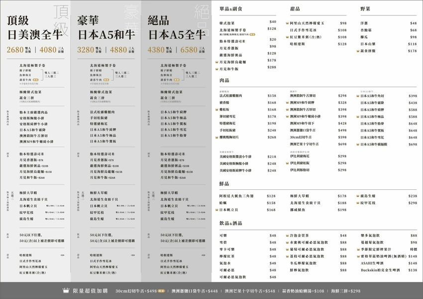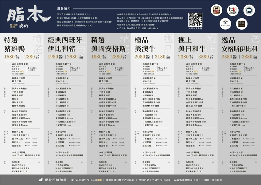 脂本燒肉的套餐選擇很多,不吃牛也有兩種套餐可以選擇,雙人套餐價位是1580~4380元,另外會酌收10%服務費,雙人套餐2380元就能吃到日本A5和牛,我今天吃的套餐是「逸品安格斯伊比利」雙人套餐2580元的價位~馬上來看看我們吃了什麼吧!