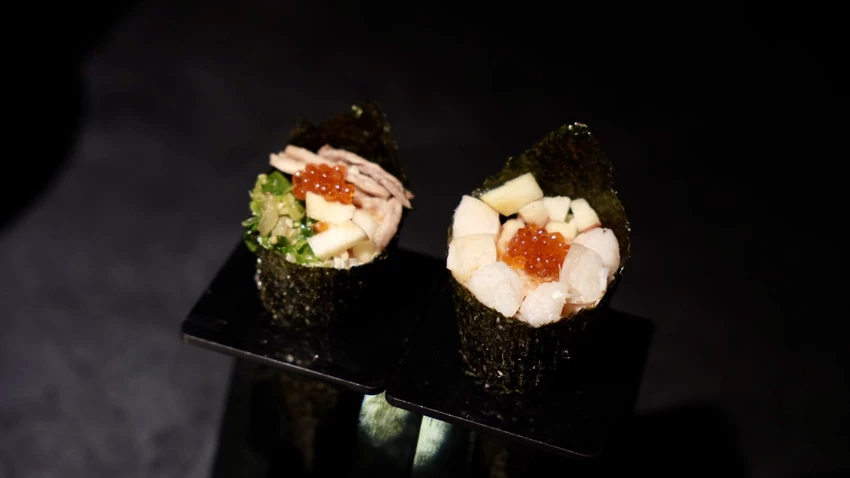 套餐包含一份前菜「北海道極製手卷」,有三種口味可以選擇:親子鮮蝦、魚卵珠貝、壽喜牛肉,我個人最喜歡魚卵珠貝,料很多又很鮮甜,手卷記得要上桌趕快吃,才能吃到脆口的海苔唷~