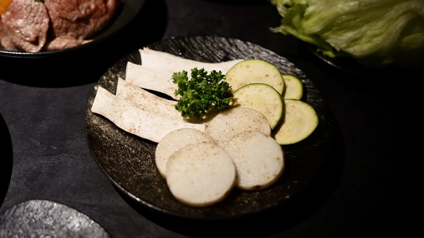 我們的套餐中的牛肉是「美國安格斯牛」,油花分布均勻像大理石紋,肉片切的有點厚度,一切不會散掉,品質真的很棒!安格斯肩胛牛小排肉質結實但又有豐富油花,所以不會難咀嚼,我覺得牛味好香又不油膩,可以搭配桌上的燒肉醬一起享用唷!