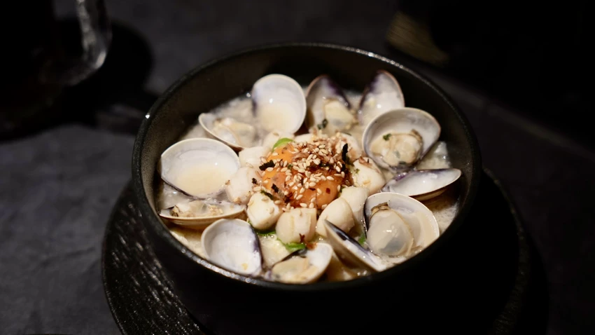 加價$158元升級「月見海鮮烏龍麵」,這是一碗超澎派的烏龍麵,上面鋪滿了蛤蜊和珠貝,湯頭都是海鮮的鮮甜,整體很清爽,與燒肉成為完美的對比。