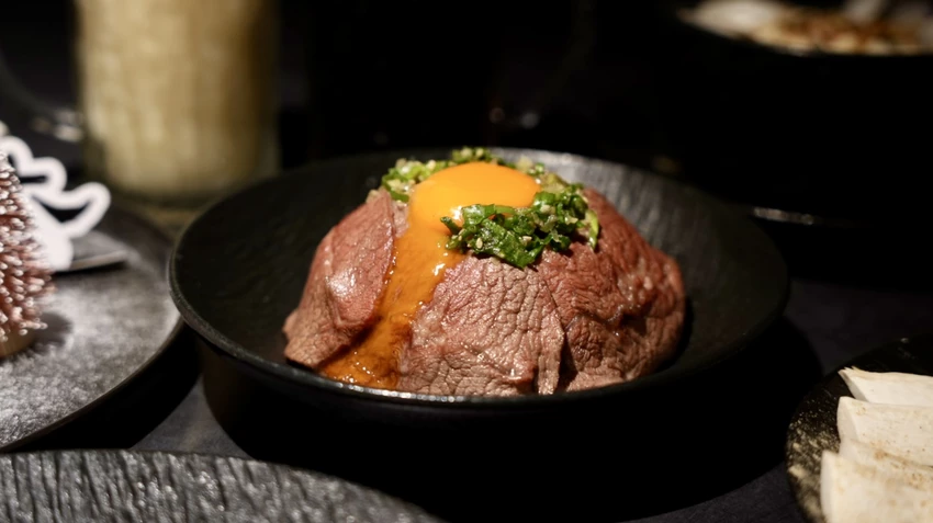 加價$268元升級「月見和牛飯」,和牛肉片鋪滿滿,上面放上一顆生食蛋黃,滑順的蛋液拌飯很好吃喔!