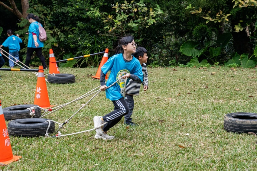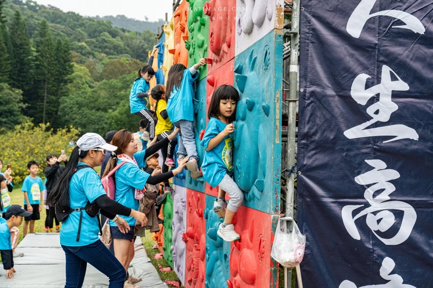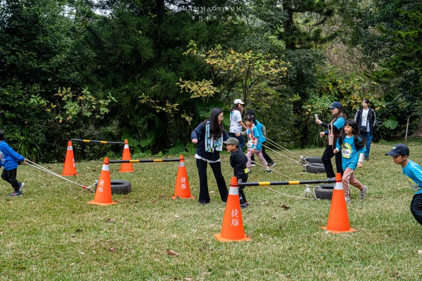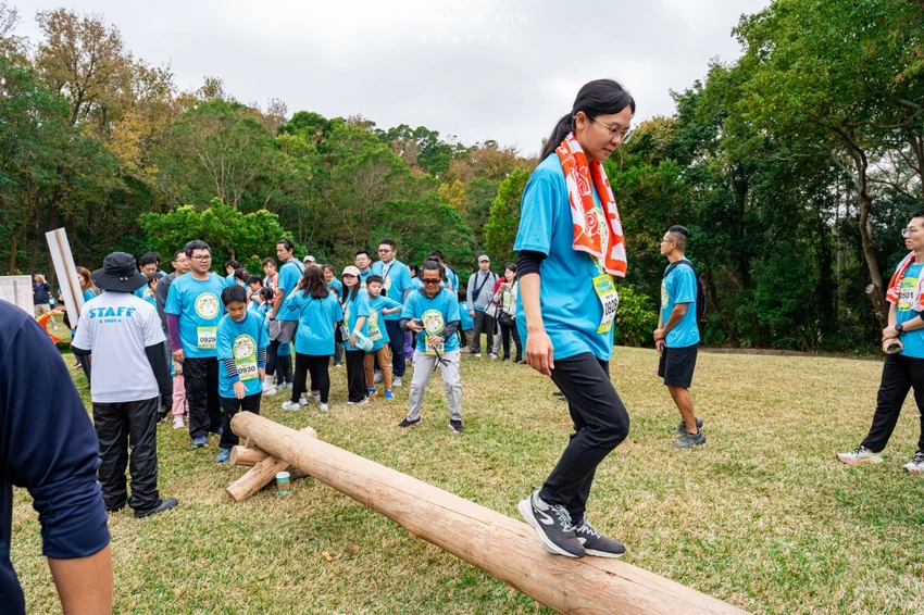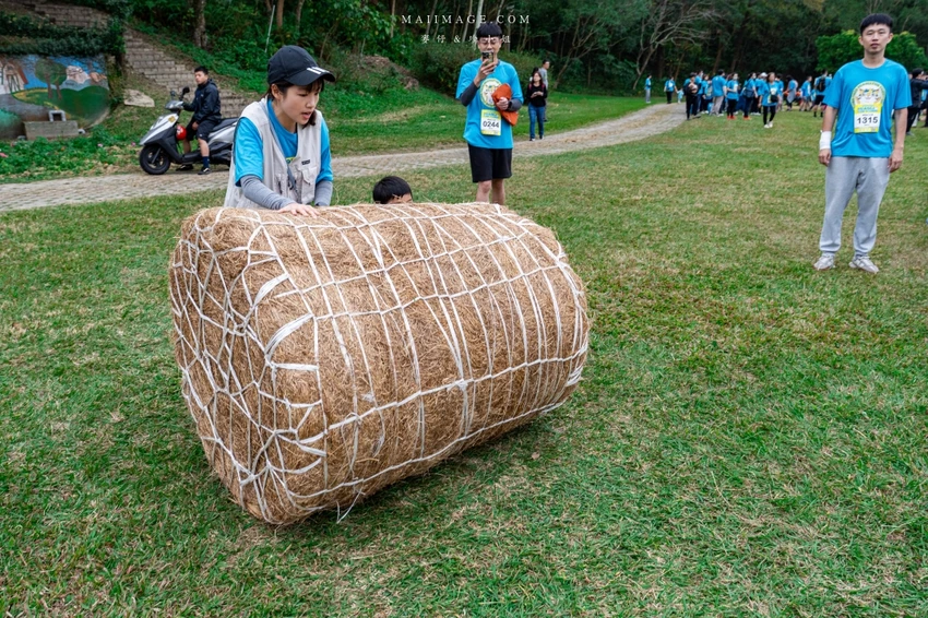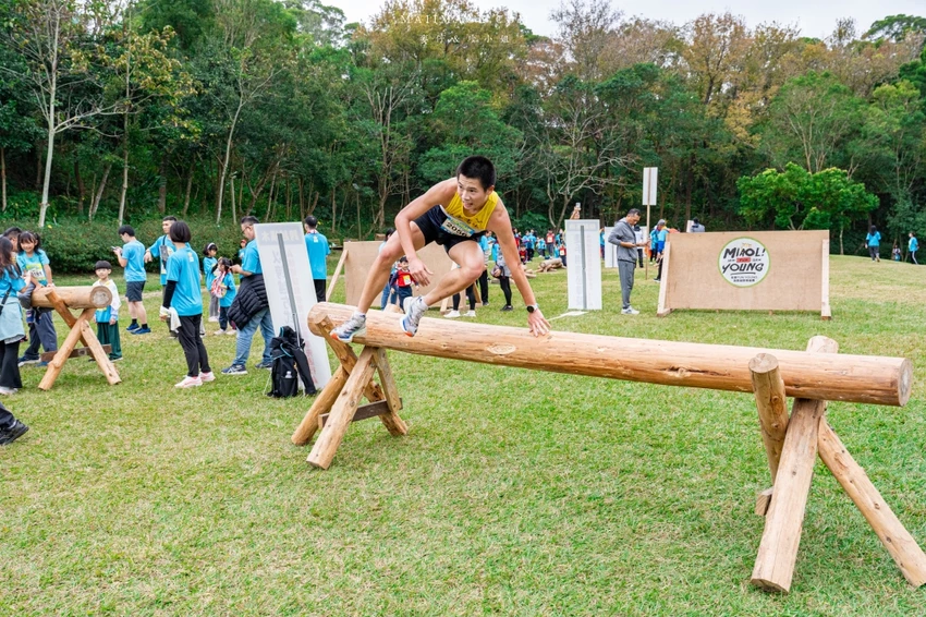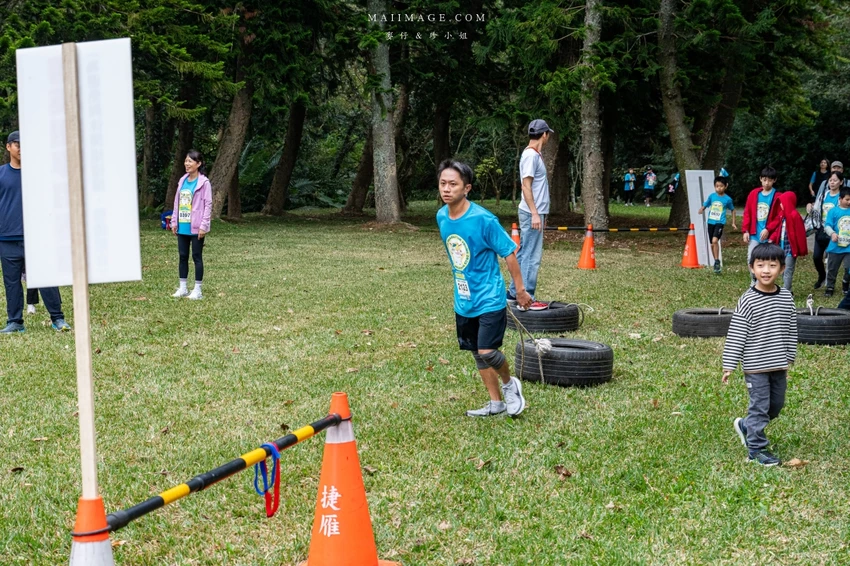 賽事核心亮點在於結合了長跑與體能挑戰的 11 道障礙關卡。從第一區的水管工人、獨木橋、攀登木板矮牆到巨木障礙,每一關都在考驗參賽者的肌耐力與協調性。特別是重達 50 公斤的「推牧草圈」,需要大人小孩合力完成,展現親子間的默契。後段的輪胎拖拉、攀岩抱石與扛沙包更是對體力的終極考驗,但也看見了孩子們跌倒後笑著爬起來的勇氣與毅力。