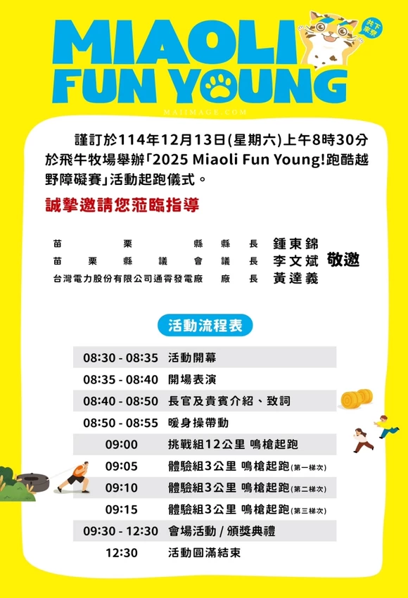 苗栗通霄的飛牛牧場不僅是北台灣熱門的度假勝地,更是全台最具特色的親子路跑舉辦地。邁入第五屆的「MIAOLI FUN YOUNG 跑酷越野障礙賽」於 12/13 盛大開跑,吸引近 2,500 名跑者共襄盛舉。賽事結合了大自然的越野地形與 11 道趣味障礙關卡,讓參賽者在奔跑中挑戰自我。完賽後不僅有超可愛的石虎獎牌與豐富好禮,現場更設有特色市集與 FUN 電樂園,是一場集結運動、公益與親子同樂的年度嘉年華。