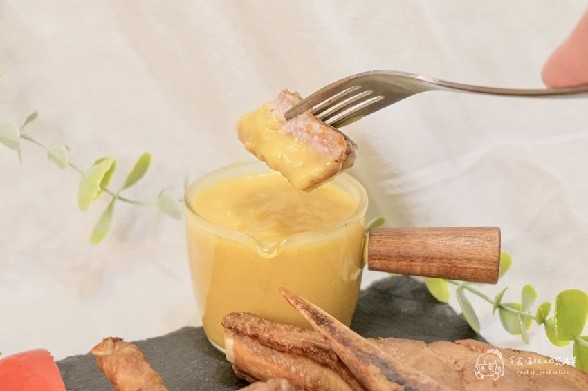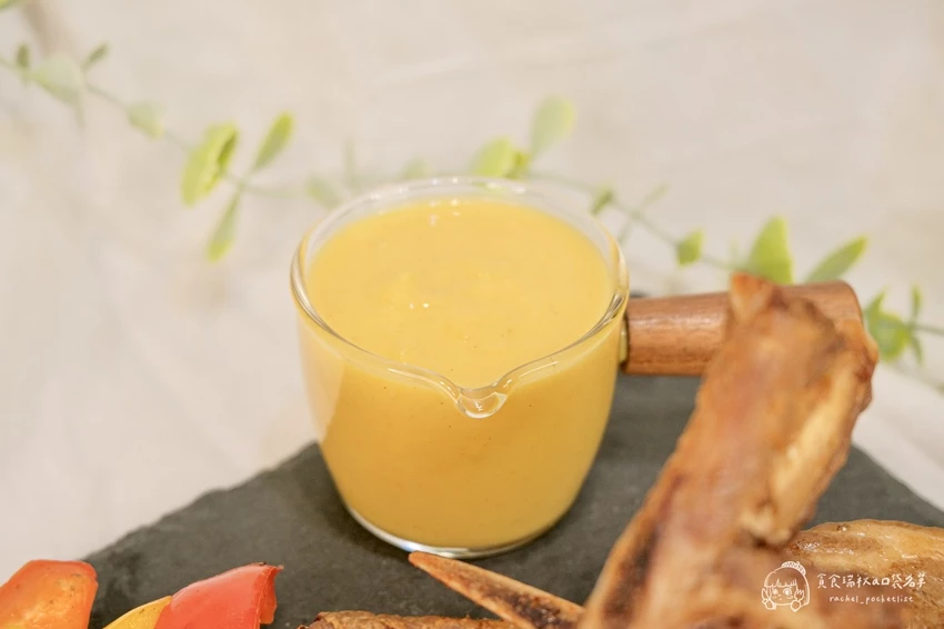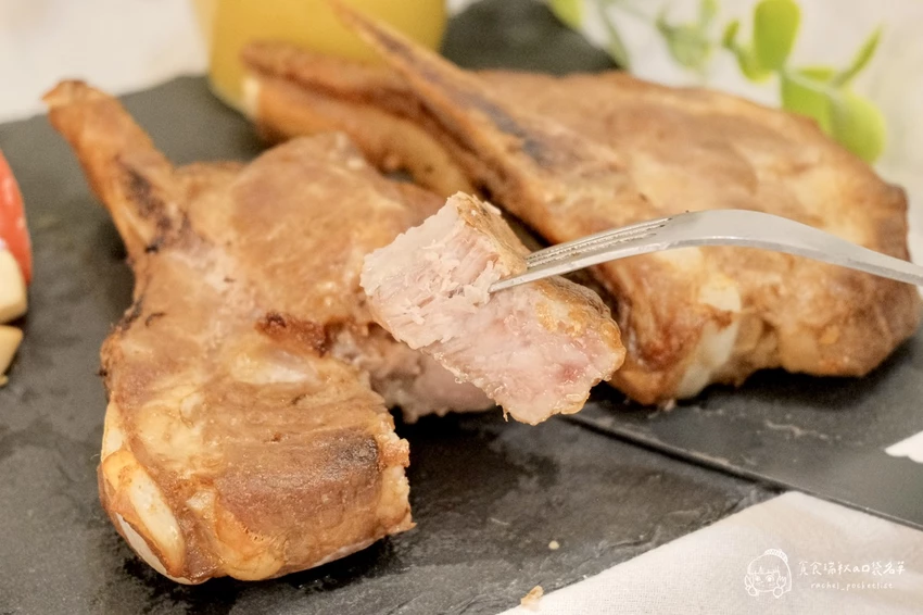 這款「鳳梨洋蔥醬烤戰斧豬排」視覺效果極佳,選用豬隻前端肩胛部位,也就是俗稱的小戰斧。肉質清甜帶有彈性,油花分布均勻,切開後能看到柔嫩的紋理,單吃就很有存在感。靈魂所在的秘製醬汁加入了大量鳳梨丁與洋蔥丁,融合獨特的南洋香料,口感酸甜爽口且料感十足,搭配厚實的豬排一起食用,既解膩又開胃。