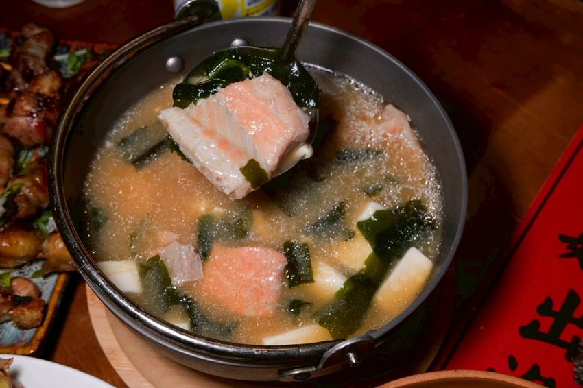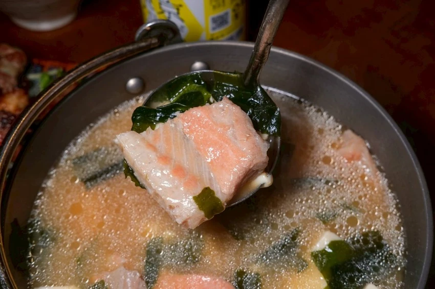▼超適合冬天的鮭魚味噌湯,熱呼呼喝起來超暖胃,湯頭是日式鹹甜調味很耐喝,裏頭可以吃到大塊鮭魚肉,非常真材實料!