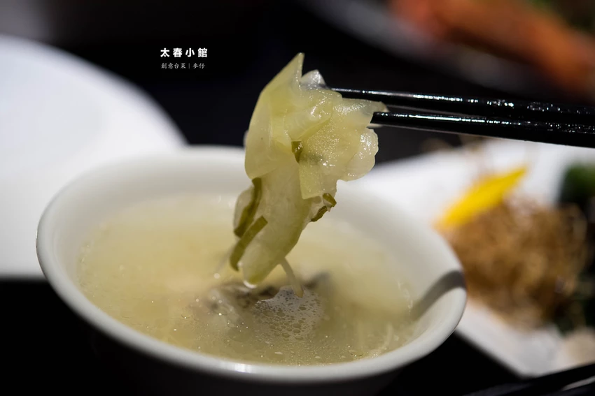 喜歡原味海鮮的朋友推薦試試「香煎鱸鰻」,肉質比想像中更為紮實有彈性,簡單煎烤後沾點椒鹽就能帶出細緻甜味。另一道特色湯品「龍膽西瓜綿湯」則充滿驚喜,選用台南特有的漬物「西瓜綿」,發酵後的自然酸香與蛤蠣、龍膽石斑一同熬煮。湯頭喝起來帶有類似酸菜的錯覺,卻更加清爽回甘,酸溜開胃的滋味讓人一碗接一碗停不下來。