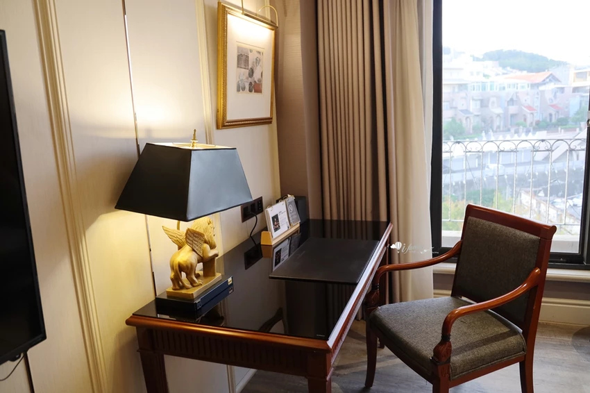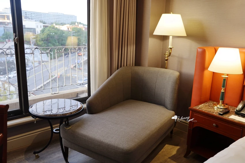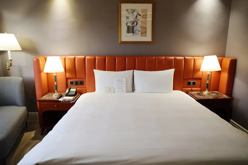 此次入住麗池館的經典一大床雙人房,大面落地窗引入自然採光,搭配歐風典雅家具,空間寬敞舒適。房內備有商務辦公桌與愜意的貴妃椅,無論是處理公務或發呆放空都很適合。床墊選用英國皇室御用的 Slumberland 斯林百蘭名床,軟硬適中支撐性佳,保證一夜好眠。房客每晚還能到香榭館一樓挑選適合自己的專屬枕頭,享受極致的睡眠體驗。