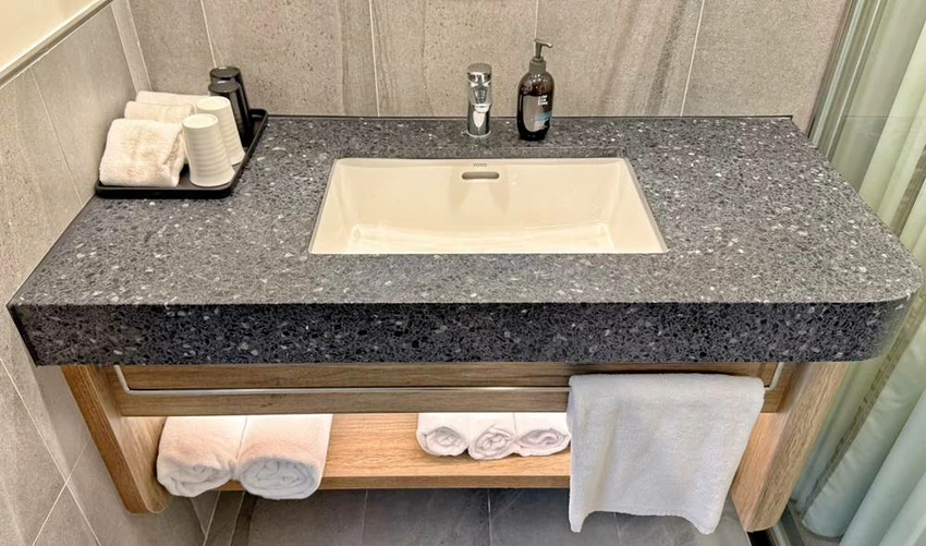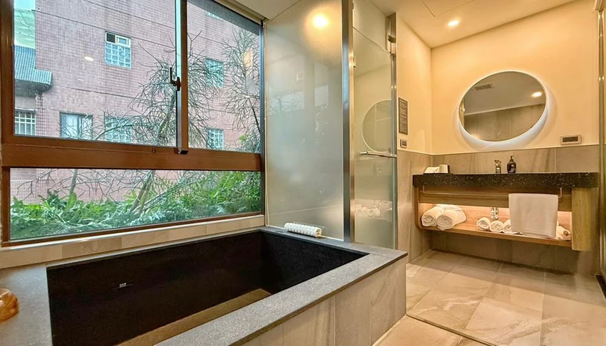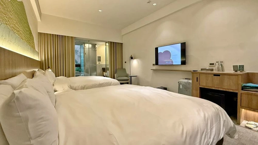 此次入住位於 7 樓的「舒境家庭房」,約 10 坪的空間配置了兩張 180x200 公分的軟硬適中雙人床,並貼心提供不同硬度的枕頭供住客選擇。房內設施一應俱全,包含液晶電視、免費 Wifi、小冰箱內的免費飲品及迎賓點心。最棒的是衛浴空間採乾濕分離設計,並設有偌大的溫泉泡湯池,寬敞到一家四口一起泡湯也完全沒問題,讓人在房內就能盡情享受礁溪美人的滋潤。