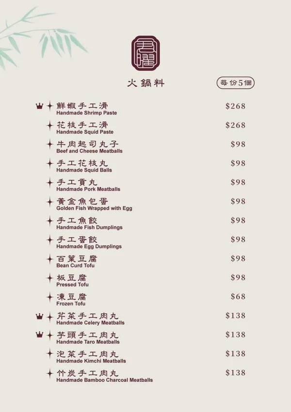 肉品方面,推薦必點油花細緻的「A5 日本和牛」(1,680 元),輕涮幾秒入口即化,肉香與雞湯完美融合;「Bellota 伊比利豬」(780 元)則帶有獨特果香,肉質彈牙不失原味。火鍋配料同樣精彩,吸滿湯汁會爆漿的「野生竹笙」(1,000 元)與口感紮實鮮美的「鮮蝦手工滑」(268 元)都是人氣單品。鮮蝦滑更能吃到整隻蝦肉,真材實料讓人大呼過癮。