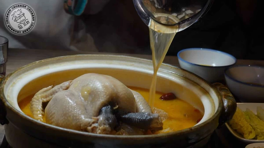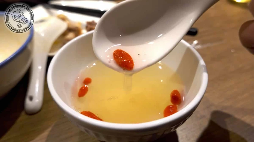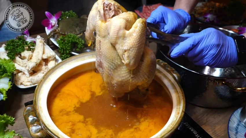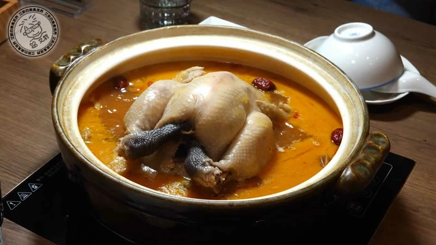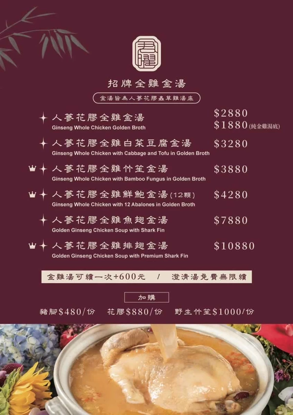 鎮店之寶「人蔘花膠全雞金湯」售價 2,880 元,被譽為神仙系雞湯。主廚採用人蔘、花膠、冬蟲夏草、金華火腿等 20 多種食材,歷經 45 道工序與 24 小時慢火熬煮。金黃色的湯頭濃郁卻不油膩,每一口都能感受到滿滿的膠質與藥膳香氣。鍋內的土雞肉質軟嫩多汁,搭配加點的 480 元豬腳一同燉煮,更能釋放出豐富的膠原蛋白,讓湯頭的濃郁度與滑順感更上一層樓。