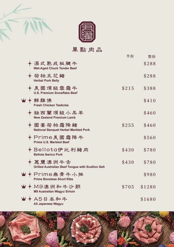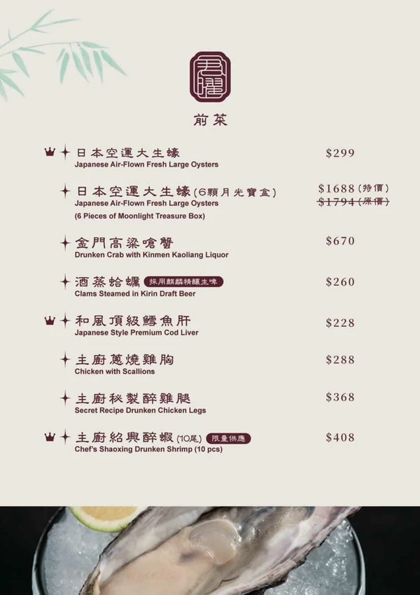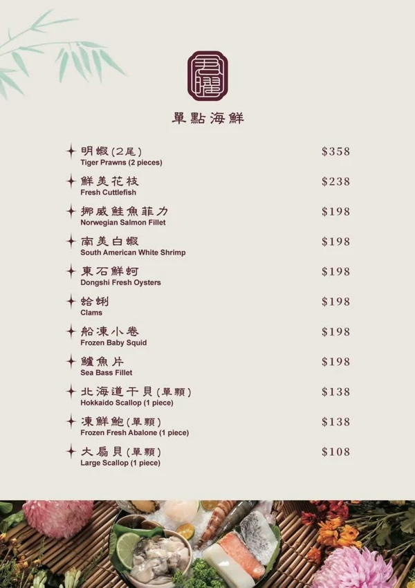 除了雞湯,海鮮也是這裡的強項。運氣好的話,還能遇到隱藏版的「沙公/沙母買一送一」活動(售價 2,880 元)。每日限量供應,建議點餐前先詢問服務人員。肥美的沙母一上桌,滿滿的蟹黃立刻引起全桌驚呼,鮮甜的蟹肉與濃郁的蟹膏融入雞湯中,鮮味加倍。此外,售價 698 元的「君曜海鮮盛合」也是海鮮控的超值選擇,多種新鮮海味一次滿足。