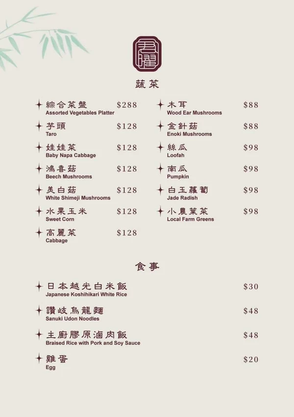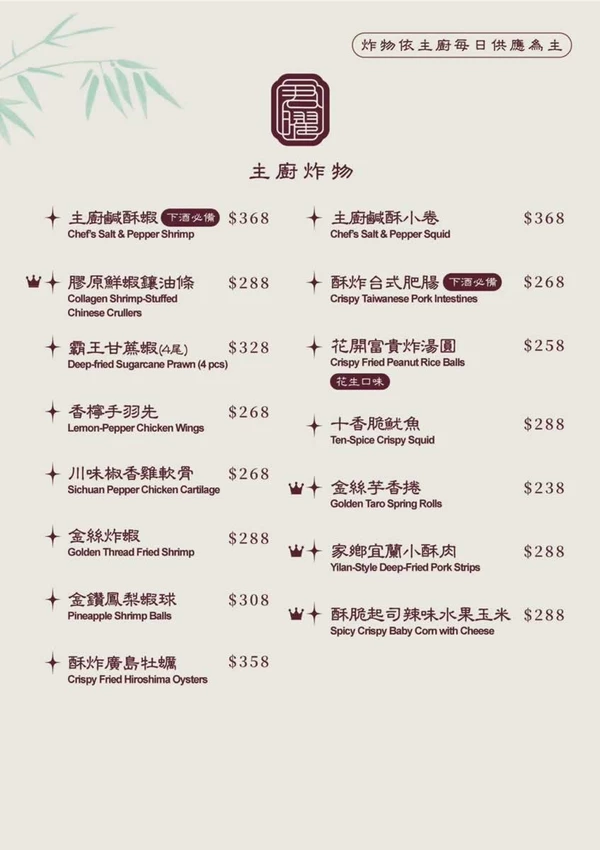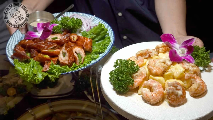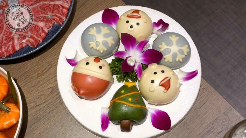 等待火鍋煮滾的空檔,不妨點幾道主廚炸物解解饞。「酥炸台式肥腸」(268 元)處理得乾淨無腥味,外酥內嫩;「金鑽鳳梨蝦球」(308 元)粉衣輕薄,蝦肉 Q 彈搭配酸甜鳳梨超開胃;「主廚鹹酥小卷」(368 元)鹹香帶辣,是最佳的下酒菜。餐後甜點也不馬虎,除了清甜滑順的冰糖白木耳,還有應景的造型包子,內餡包含奶皇、豆沙與芋頭,可愛又好吃,為這頓饗宴畫下完美句點。