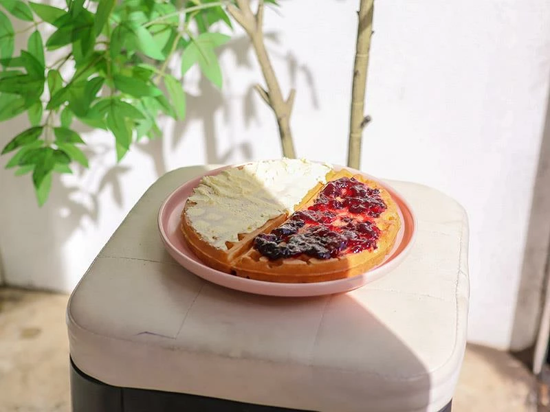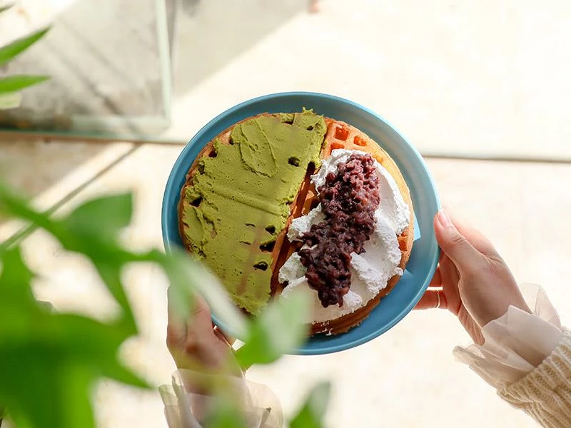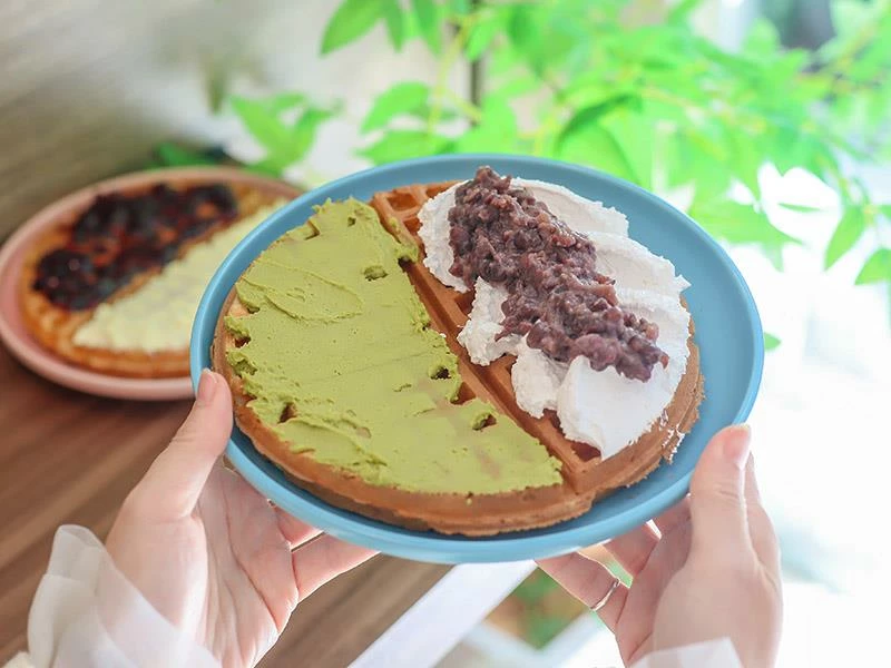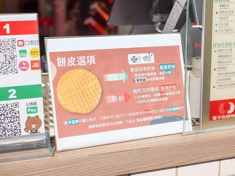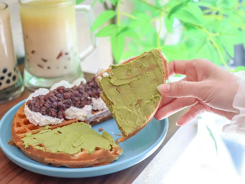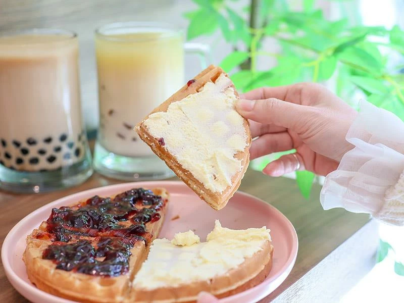 雪子鬆餅之所以能累積眾多熟客,關鍵就在於其獨特的餅皮口感。使用自家研發的發酵鬆餅粉製作,剛烤好時內部濕潤軟綿,但最神奇的是在放涼之後,外層會轉化為如麵包般酥脆的口感,完全沒有一般鬆餅冷掉後濕軟油膩的問題。這種經得起時間考驗的美味,非常適合外帶回家慢慢享用,甚至是買回家自己用烤箱回烤,都能還原那份迷人的酥脆度,是店家對品質細節的堅持展現。