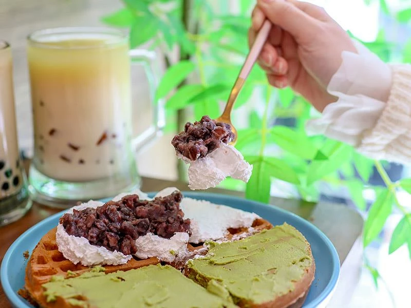 甜食控來到這裡,絕對不能錯過人氣招牌「鮮奶油抹茶紅豆鬆餅」。這裡的鮮奶油帶有良好的支撐度,入口即化且不顯油膩,抹茶粉香氣乾淨純正,沒有過度的苦澀味。最厲害的是店家每日親自熬煮的紅豆餡,保留了顆粒感與綿密豆沙,甜度控制得恰到好處,完美襯托出抹茶的清香。由於紅豆餡是每天新鮮製作,賣完就沒有了,想吃的朋友建議提早預訂以免撲空。