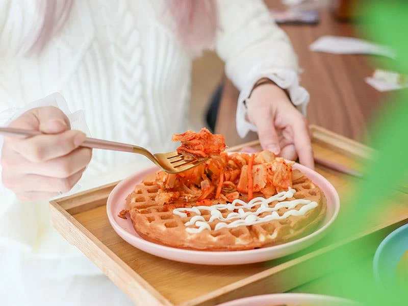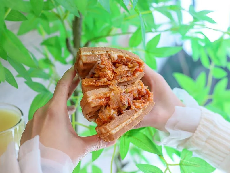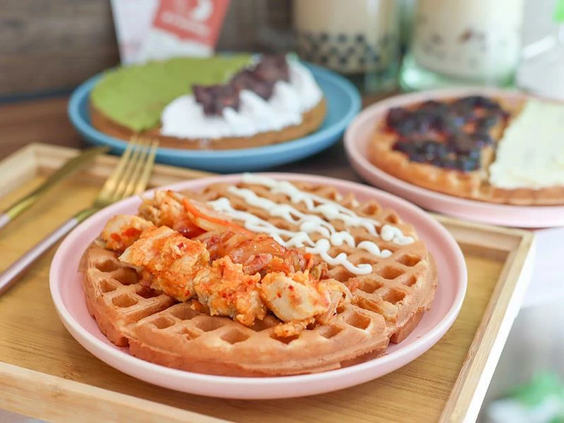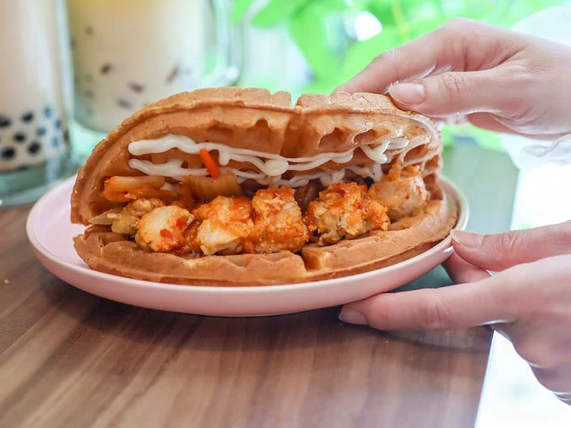 不想吃甜食的朋友,這款「韓式泡菜嫩雞鬆餅」是極佳的鹹食選擇。內餡夾入帶有微辣口感的韓式泡菜,酸香開胃的滋味非常解膩,搭配口感鮮嫩不乾柴的雞肉,整體風味平衡得宜。酥脆的鬆餅皮包裹著濕潤的鹹香餡料,吃起來清爽不厚重,份量也相當剛好。對於附近的粉領族或不想吃正餐的人來說,這款鬆餅絕對能當作一份滿足又無負擔的輕食午餐。