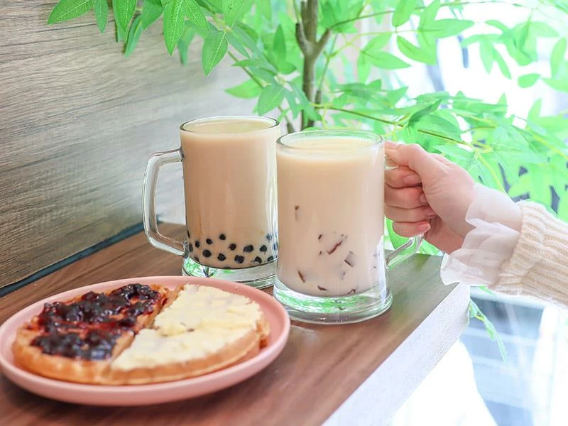 品嚐鬆餅之餘,來杯好茶更是絕配。「珍珠紅茶拿鐵」茶香明顯,奶味不搶戲,珍珠口感偏 Q 彈不軟爛;而更令人驚豔的是「手摘茶凍青奶茶」。入口就能感受到獨特的茶香,原因在於茶凍是使用自家好茶製作,而非靠烘焙硬湊出的濃厚感。吸一口就能感覺到自然的茶感在嘴裡慢慢散開,搭配鬆餅一起享用,清爽回甘又解膩,是店內不可錯過的飲品選擇。