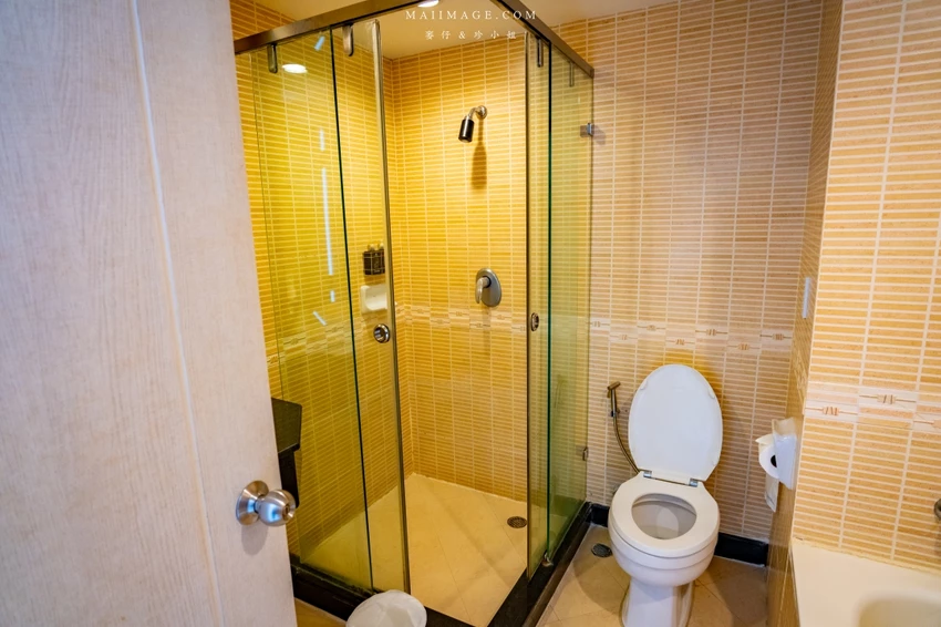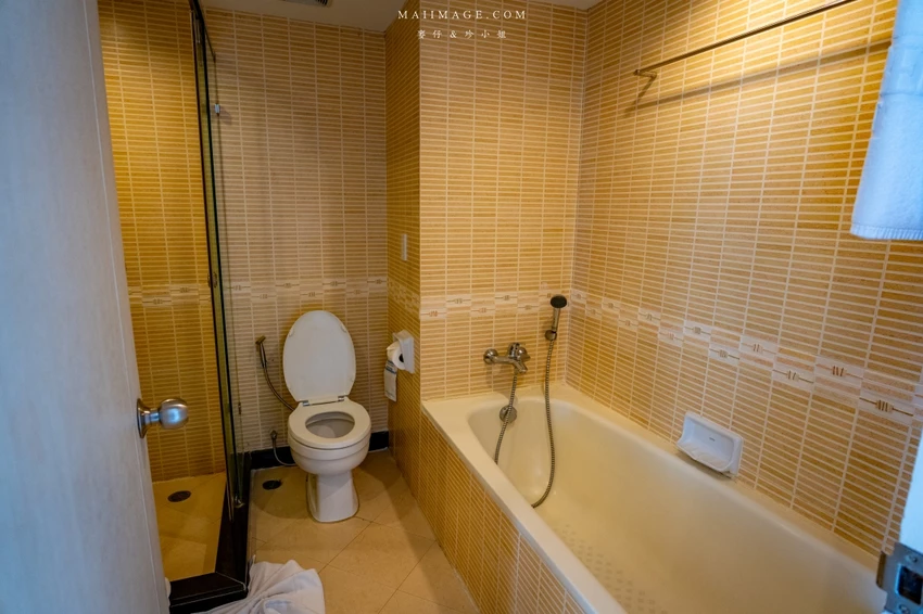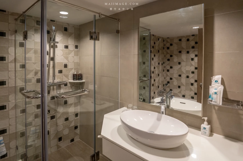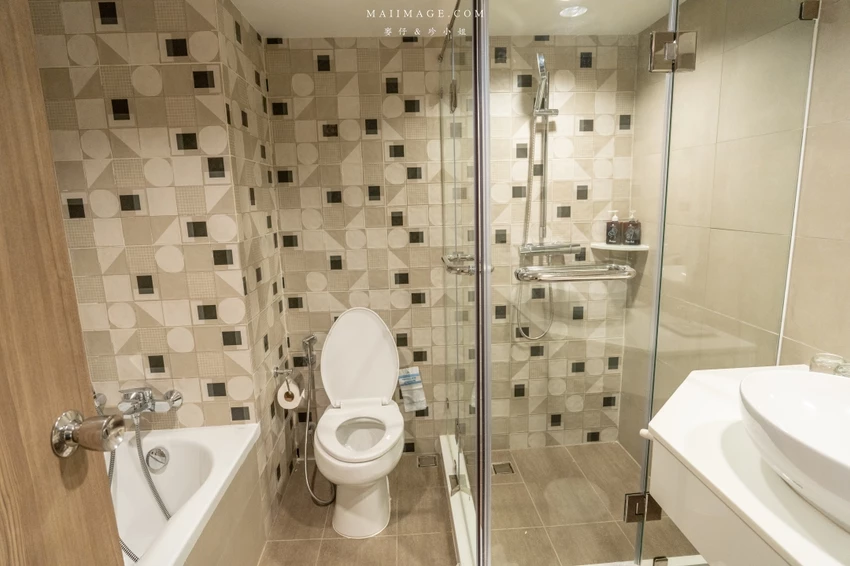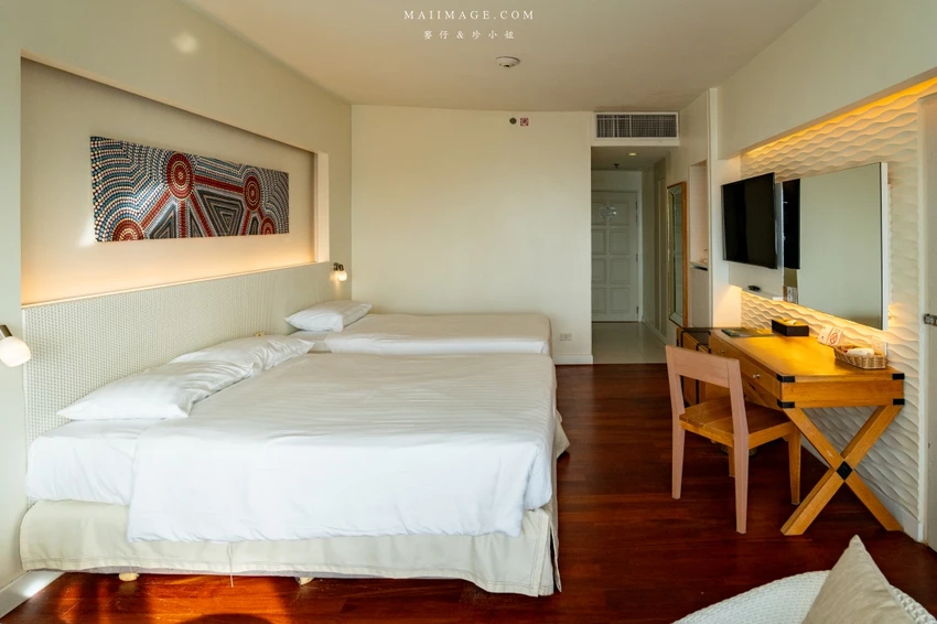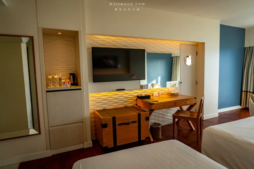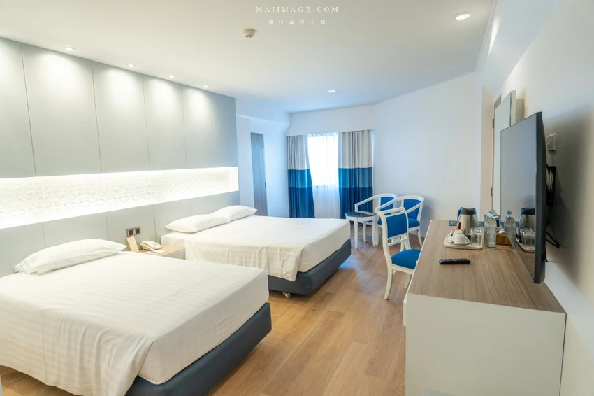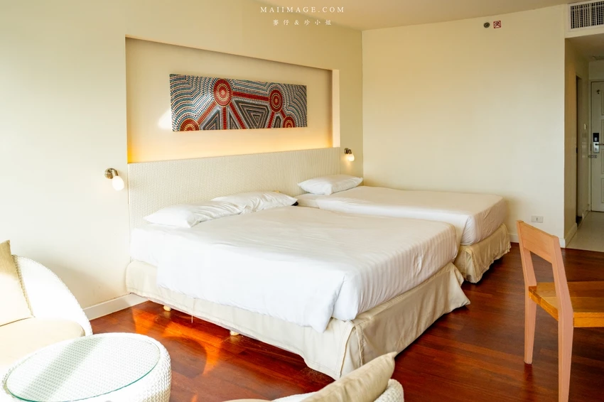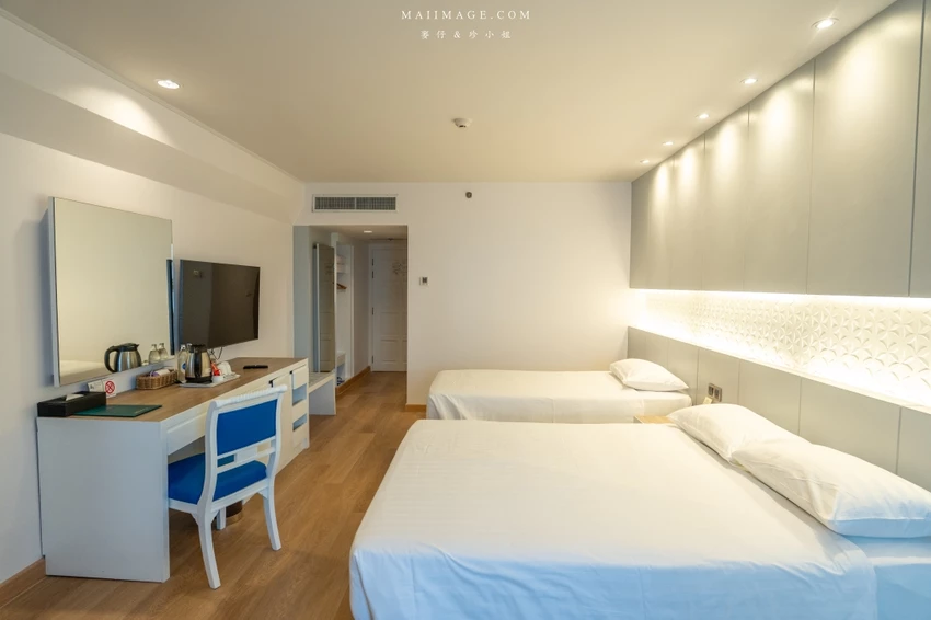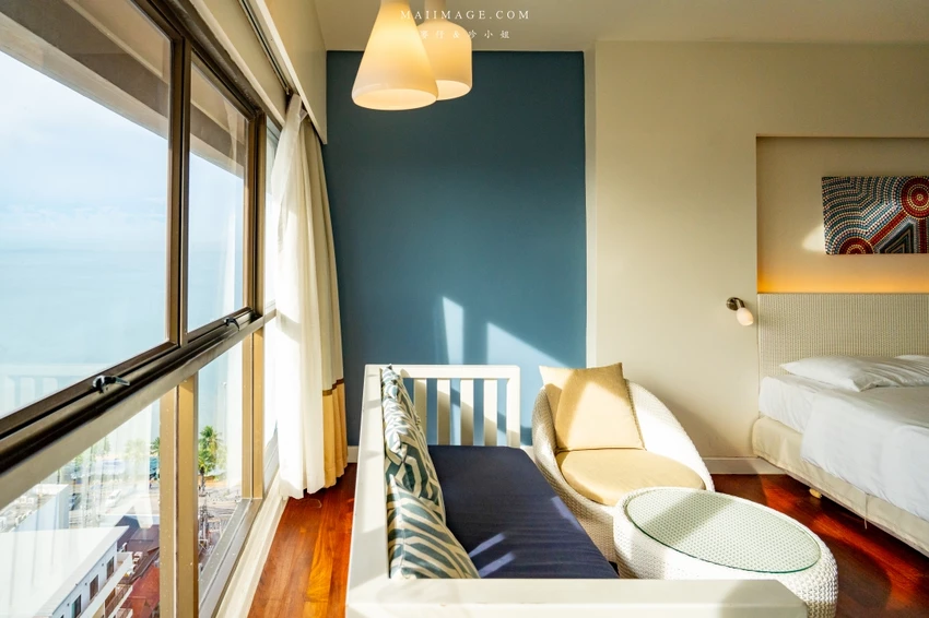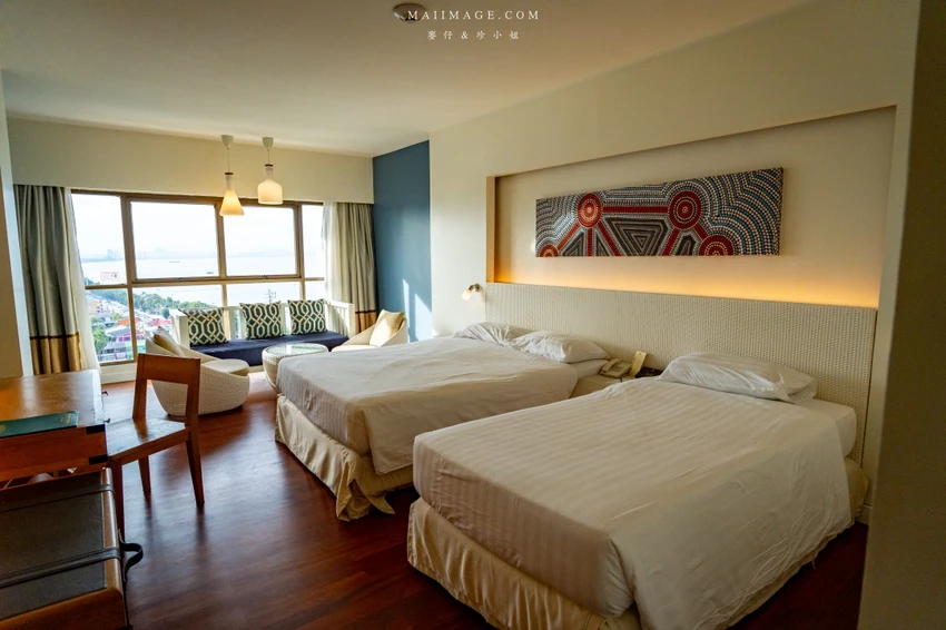 這次幸運入住面海的「豪華海景雙人房」,廣達 48 平方呎的寬敞空間,配置了一張大床與一張單人床,還有獨立的小客廳沙發區。最令人驚豔的莫過於窗外那片無敵的中天海灘海景,藍天白雲搭配湛藍海洋,光是待在房間發呆就無比愜意。房內設施一應俱全,包含獨立浴缸與乾濕分離衛浴,玩累了泡個澡消除疲勞,享受這份專屬的慵懶時光。