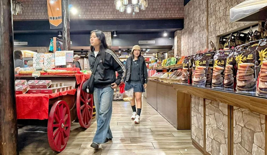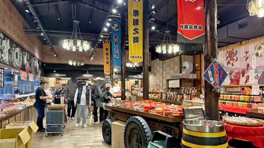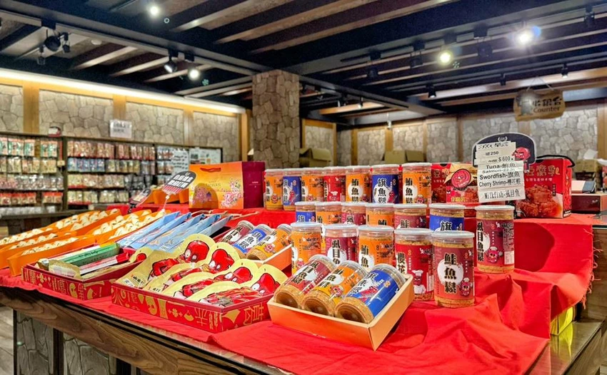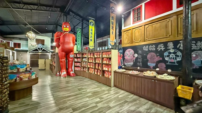 來到窯烤山寨村,絕對不能錯過這裡的招牌美食——「惡棍麵包」。這款長達 70 公分的軟法麵包,不僅造型搶眼逗趣,更與赤鬼手中的武器相互呼應。除了原味,店內也販售蒜味乳酪等口味,麵包體帶有嚼勁且香氣十足。此外,館內也轉型為豐富的伴手禮販售區,提供各式糕餅、零嘴與特色點心。雖然現在以商品販售為主,但若想尋找具話題性又好吃的宜蘭名產,這裡依然是不錯的採購選擇。
