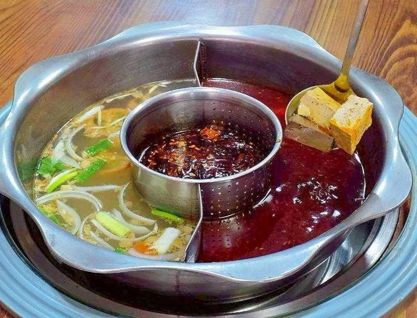 十三涮主打的是經典的重慶老火鍋鴛鴦鍋,一邊是清甜耐煮的大骨湯,另一邊則是重慶麻辣鍋。特別的是,所有辛香料都集中放在鍋中央的圓形香料槽中,煮的過程中不會到處漂浮,入口時只留下純粹的湯香,不會撈到滿嘴香料渣,這點真的很加分。
