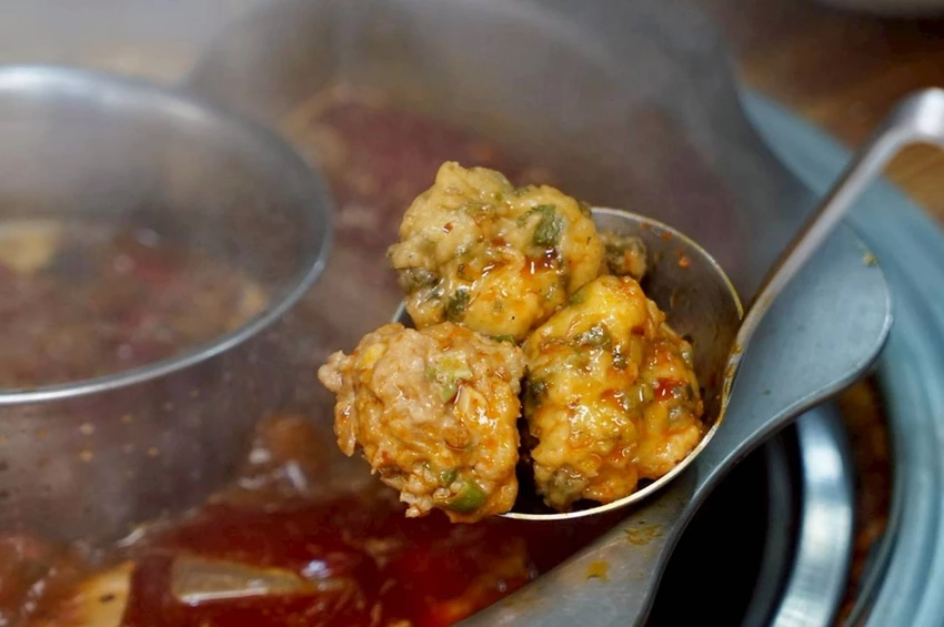 重慶老火鍋必須搭配的食材有豬腦花、毛肚、鴨腸、牛三寶、脆黃喉、但也是要依照個人的喜好來決定啦!比較讓人想不到的是這裡竟然有滑嫩溫體牛肉、且綜合手工丸的口味是香菜花枝丸與荸薺豬肉丸呢