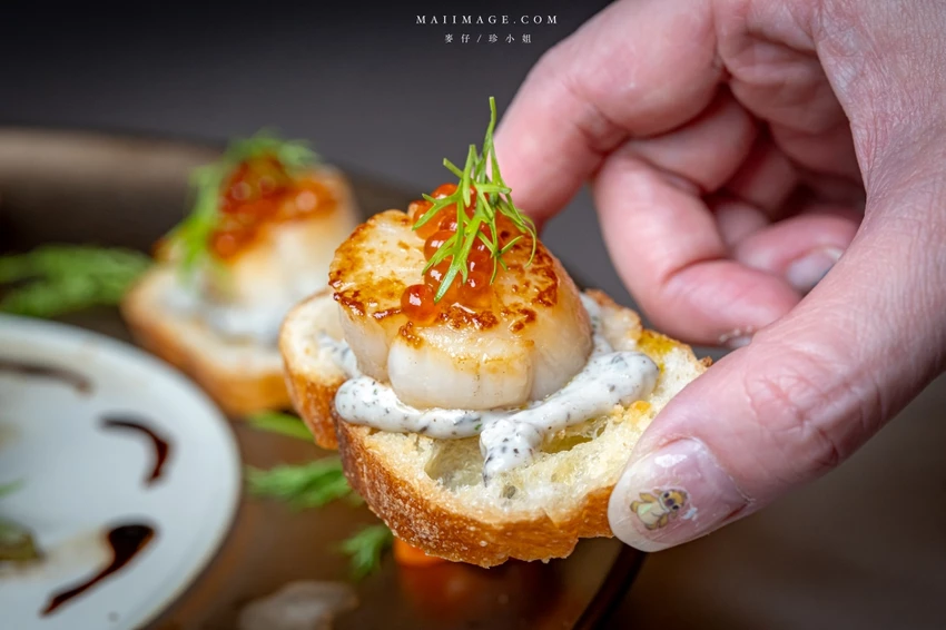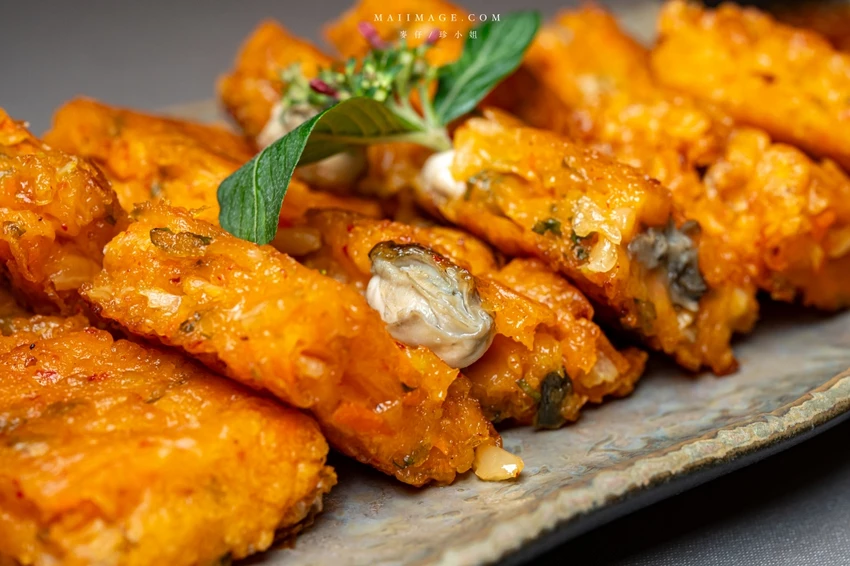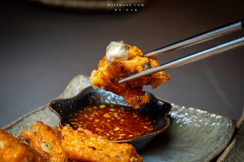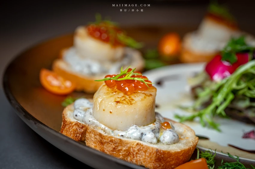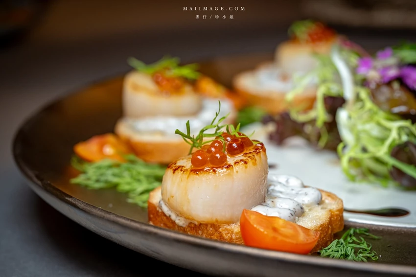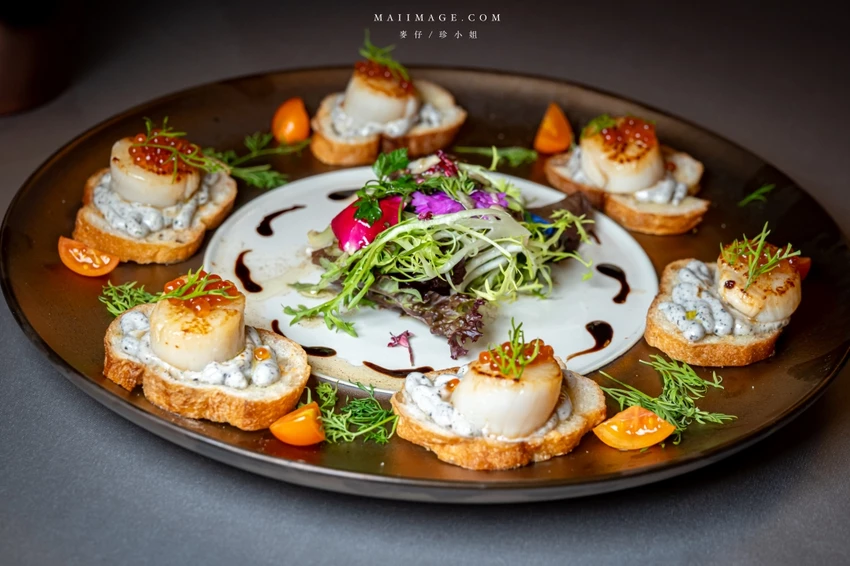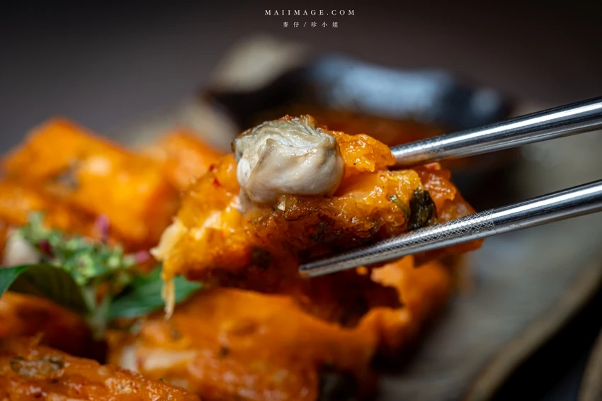 聚餐開場推薦份量十足的「凱薩沙拉」,足夠 6 人享用,豐富的蔬菜搭配帕馬森起司與特調醬汁,口感層次豐富。熱前菜則必點招牌「海鮮煎餅」與「泡菜煎餅」,厚度十足且外皮煎得酥脆焦香,尤其是泡菜口味中的鮮蚵肥美碩大,鮮度爆表。另一道視覺系料理「香煎干貝鮭魚卵佐松露醬」,將炙燒生食級干貝佐以鮭魚卵與黑松露美乃滋,一口咬下海味與松露香氣在口中交織,奢華滋味令人難忘。