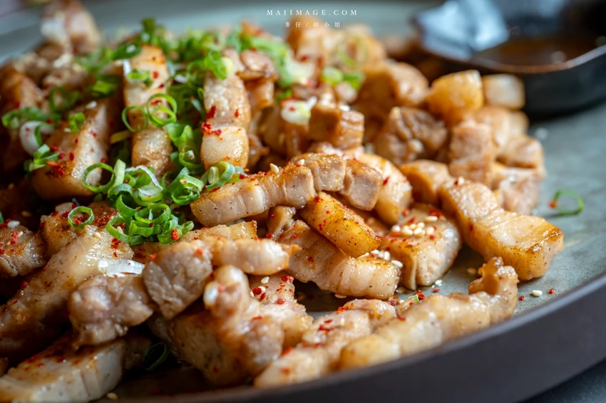 來到 Anju 不只能喝調酒,紅白酒的搭配更是一絕。經理 Ami 本身是擁有國際證照的日本酒唎酒師,能依據餐點提供專業建議。例如品嚐「韓式炙烤豬五花」時,推薦搭配義大利紅酒,能讓焦脆的五花肉與韓式秘醬的風味更上一層樓。這道菜肥瘦均勻,搭配紅洋蔥與生菜包裹食用,清爽解膩又過癮。