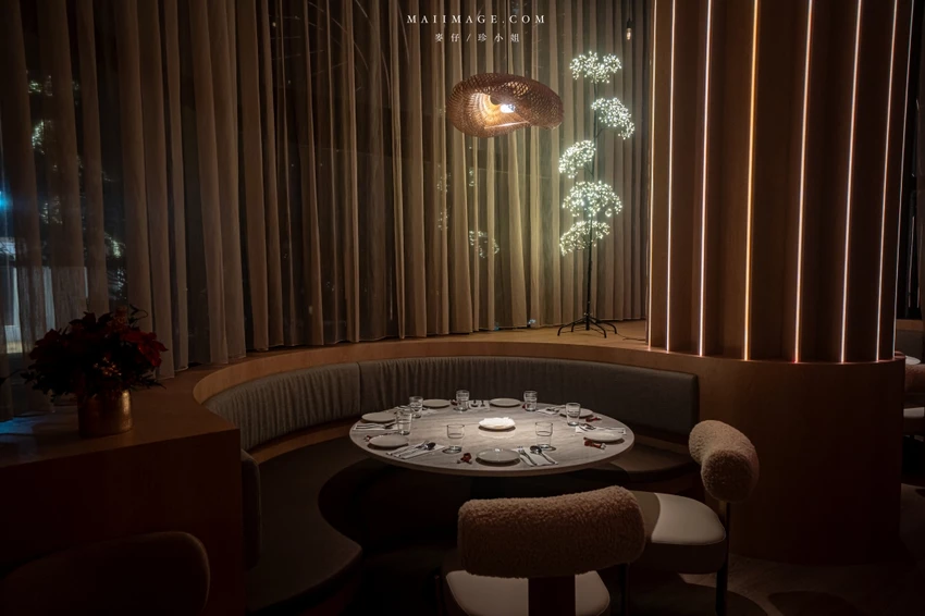 店內設計極具質感,挑高的天花板搭配中央延伸的「光之樹」,營造出溫暖而氣派的用餐氛圍。座位規劃多元,從適合三五好友的圓桌到充滿前衛低調感的酒吧專區應有盡有。若是想要小酌一杯,酒吧區的氛圍隱密且放鬆;而一般用餐區則在柔和燈光的映襯下,顯得格調高雅,無論是白天或夜晚造訪,都能感受到截然不同的空間魅力,非常適合約會或聚會。