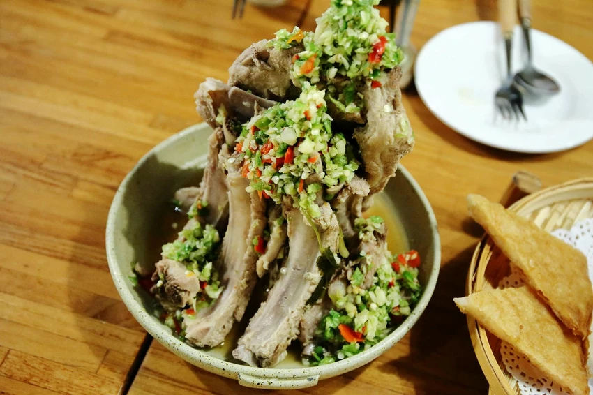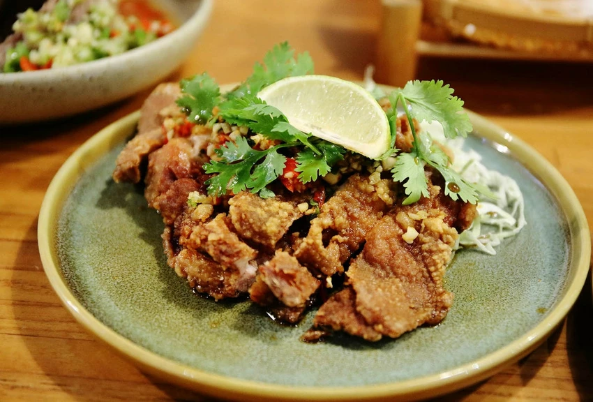 酥脆外皮紮實彈嫩雞腿肉,搭配上獨門配方的椒麻醬汁