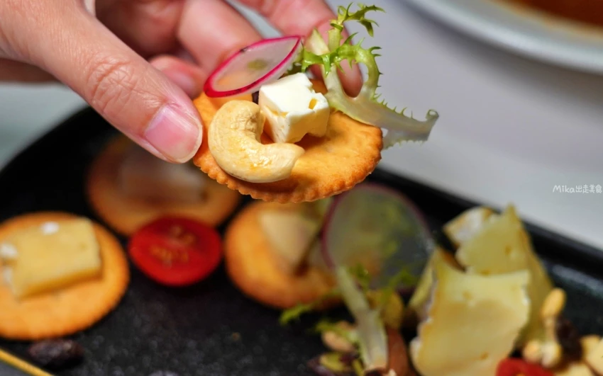 餐點以歐式料理為主,前菜表現相當亮眼。「義大利鴨胸柳橙沙拉」選用煎至外酥內嫩的鴨胸,釋放出迷人的油脂香氣,搭配櫻桃番茄與酸甜柳橙醬,清爽又開胃。佐酒必備的「綜合起司盤」層次豐富,搭配水果與餅乾是起司控的最愛。湯品推薦「嫩煎干貝法式奶油龍蝦湯」,生食級干貝鮮嫩,濃郁的湯頭充滿海味,證明了這裡不僅音樂好聽,餐點水準也令人驚艷。