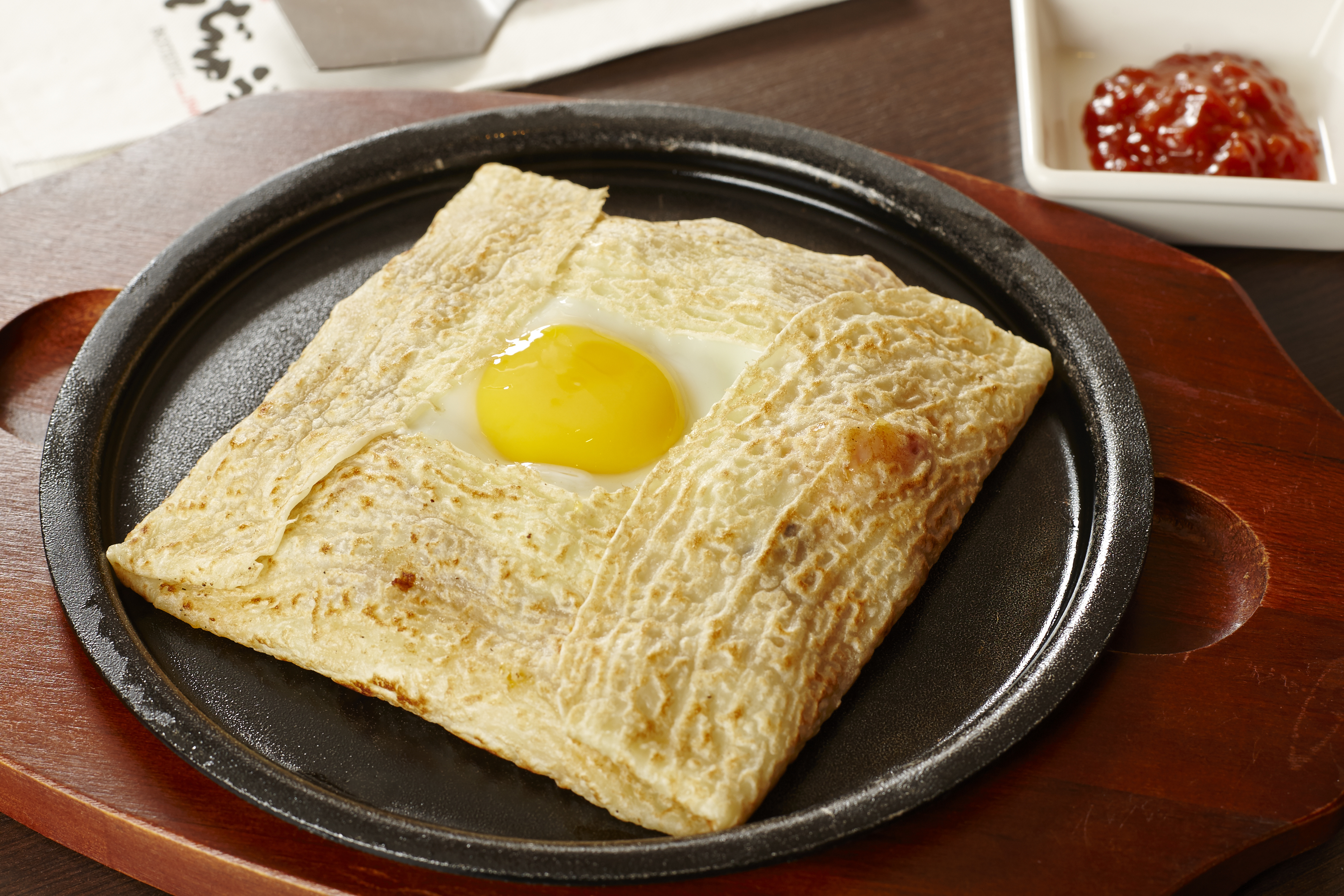 法式薄餅口感綿密細緻,捲成盒狀,鑲入鹹香的培根,與起司與洋芋一起拌炒,再打上一個半熟蛋,注入法式風格的日式鐵板料理,異國風交織出迷人口感!