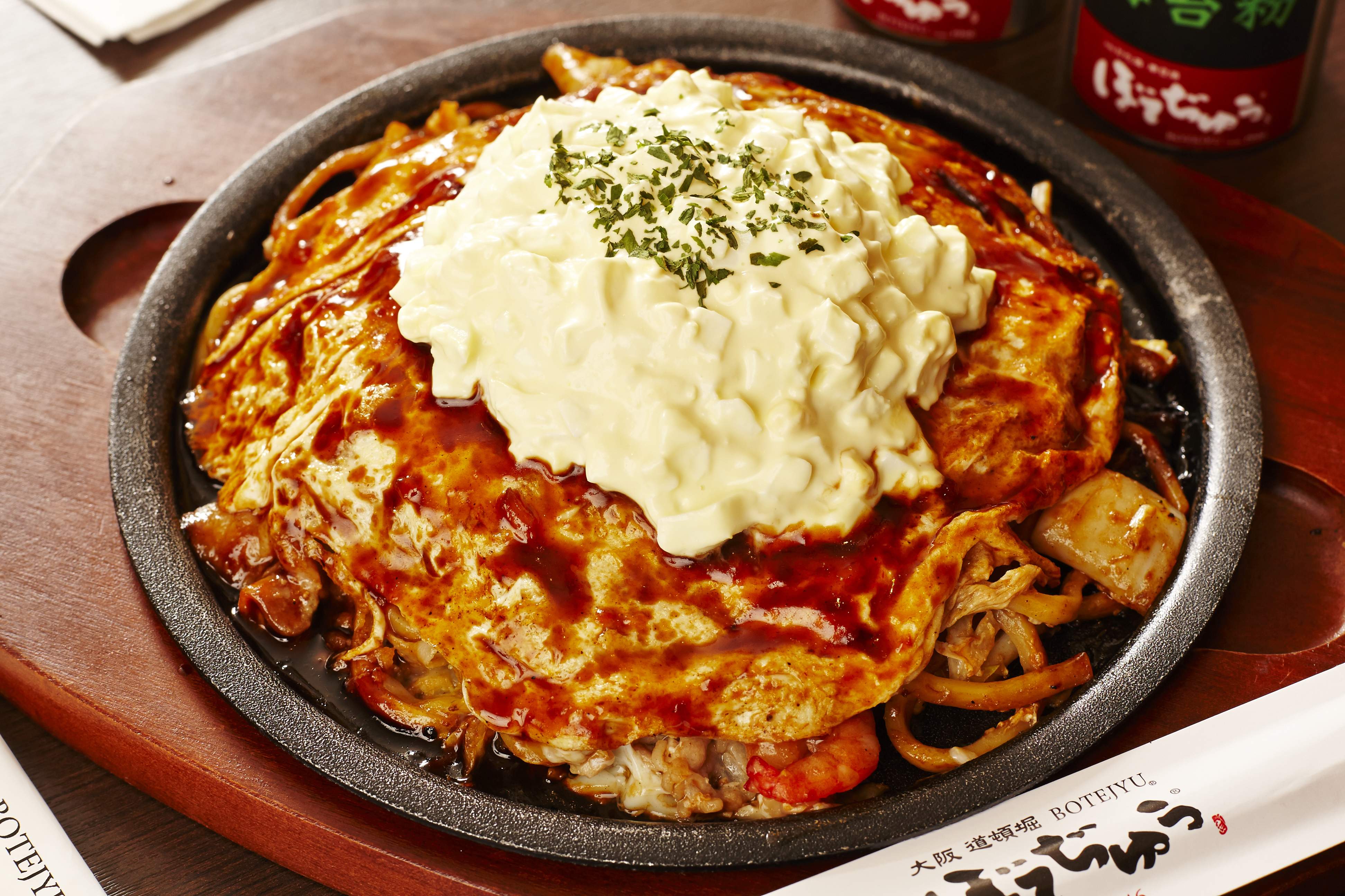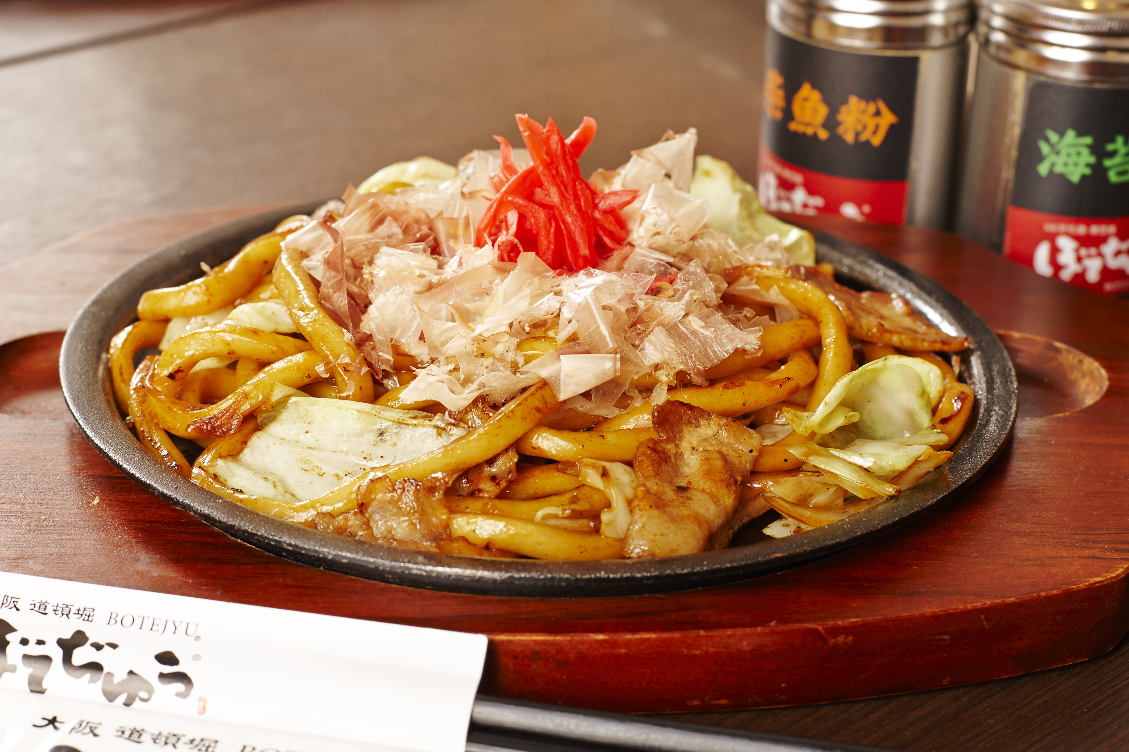 肥瘦均勻的豬五花與Q彈的烏龍麵,加入用昆布高湯和鰹魚高湯,這也是BOTEJYU為鐵板炒麵而專門作成的自家製「炒麵高湯」,再淋上濃稠的秘傳醬汁,是使用大量蔬菜、水果,和30種以上的香料融和烏斯特郡醬油,講究的手作製法創造出了獨特的風味!