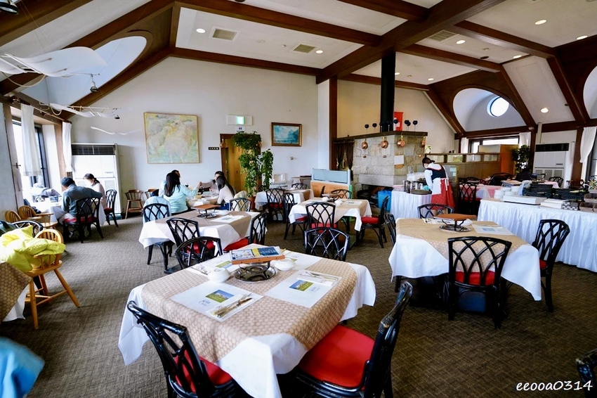餐廳位於二樓,空間寬敞、採光不錯,可以眺望牧場風光。