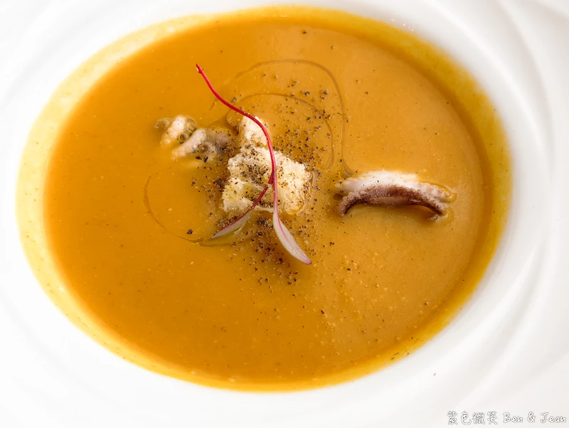 南瓜馬鈴薯濃湯佐烤章魚,這道嚐得到南瓜的天然清甜與馬鈴薯的濃郁卻又絲滑的口感