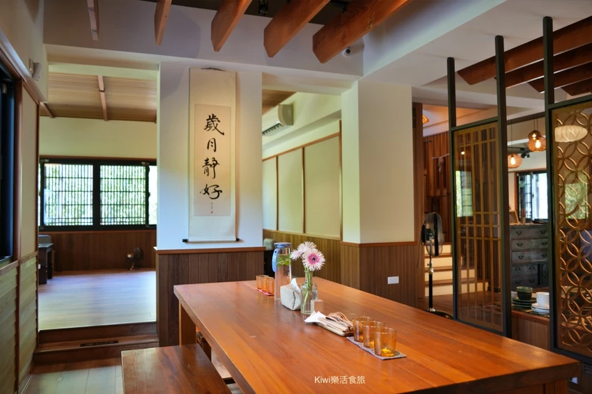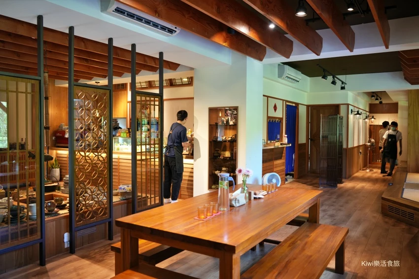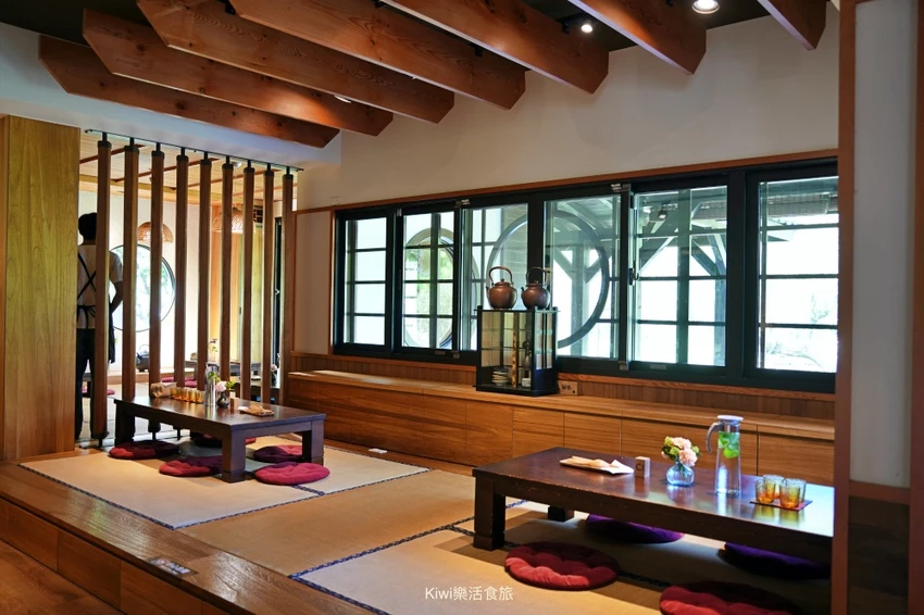 餐廳內部採用日式木造建築設計,空間寬敞明亮,當陽光透過大片落地窗與木格窗灑落時,空氣中彷彿飄散著淡淡的檜木與茶香,展現出獨特的侘寂之美。入內用餐需要脫鞋並穿著襪子,座位多為榻榻米形式,若有長輩同行或腰力不好的朋友,建議可安排靠窗的一般座位。坐在窗邊看著池塘裡悠游的魚兒,搭配遠處的山巒背景,氛圍沉靜而療癒,是讓人放鬆身心的絕佳空間。