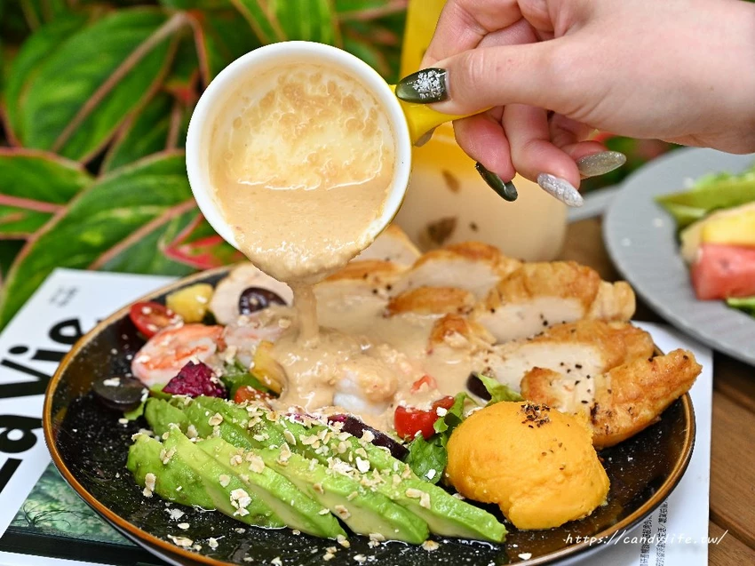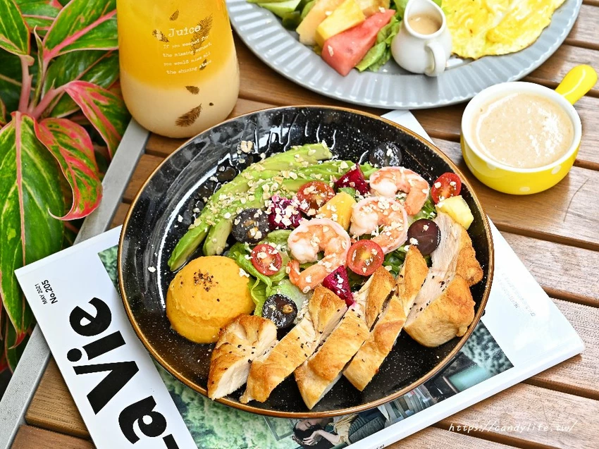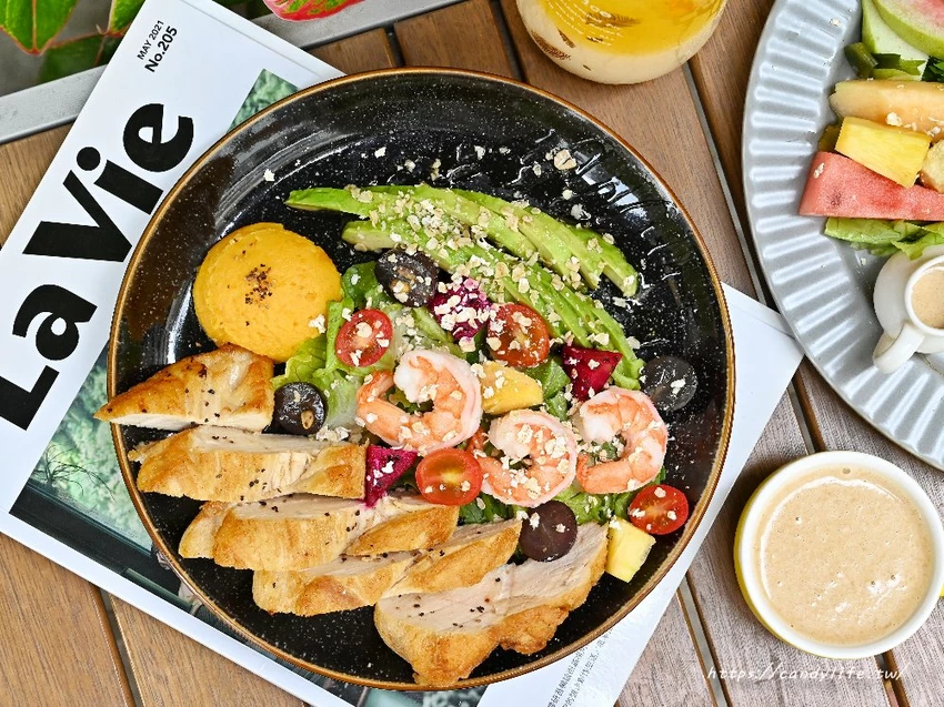 整盤沙拉色彩繽紛,光看就讓人食指大動,主食部分給得非常大方,包含香煎雞胸肉,切得厚實,表面煎至微焦香,內裡軟嫩不乾柴,還有鮮蝦,貼心去殼的鮮蝦肉質Q彈鮮甜,飽滿的個頭誠意十足,另外酪梨選用熟度剛剛好,質地如奶油般滑順,入口即化,與雞胸肉搭配在一起更是增添了豐富的層次感