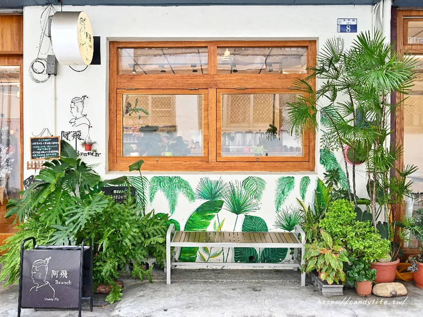 阿飛Brunch 隱身在台中東區大智路的巷弄間,鄰近台中火車站與大魯閣新時代購物中心,無論是從火車站步行過來,或是逛完附近的帝國糖廠、台中文創園區順道朝聖都非常方便,店面外觀被大量綠色植栽環繞,搭配生動的綠葉手繪牆,濃郁的森林系風格在巷弄中顯得格外清新,光是踏到門口就讓人感到放鬆
