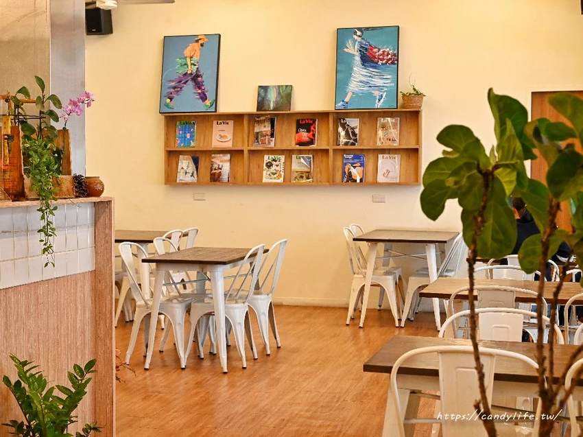 店內採光明亮,座位配置多為俐落的白色鐵椅與木質長凳,部分座位還貼心附上植物圖騰的靠枕,讓人一坐下就不自覺想放慢腳步。此外,牆上的壁掛書架陳列著各式雜誌,無論是獨自一人來享受寧靜的早晨,或是與好友聚餐,都能在這個充滿藝術氣息的空間裡,感受到如家般的自在與舒適