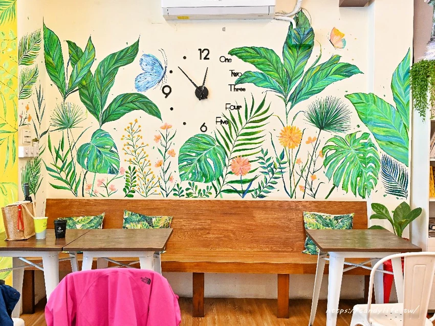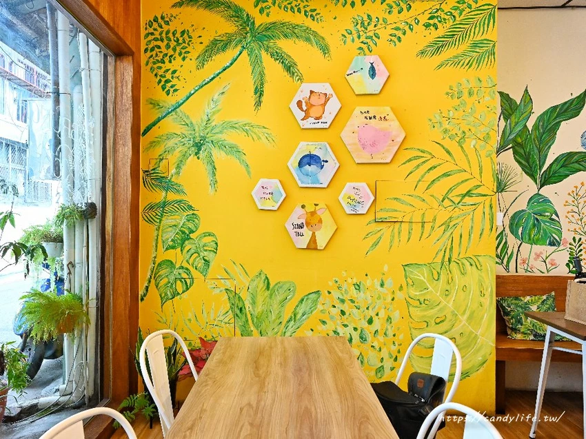 店內空間雖然不算大,卻佈置得極具巧思與溫度,最吸睛的莫過於牆面上大片的原創手繪壁畫,以鮮豔的黃色與充滿生機的翠綠葉片為底,勾勒出如叢林般放鬆的視覺感,牆上還裝飾著可愛的動物插畫與勵志小標語,搭配溫暖的木質調地板與桌椅,營造出一種既活潑又溫馨的氛圍