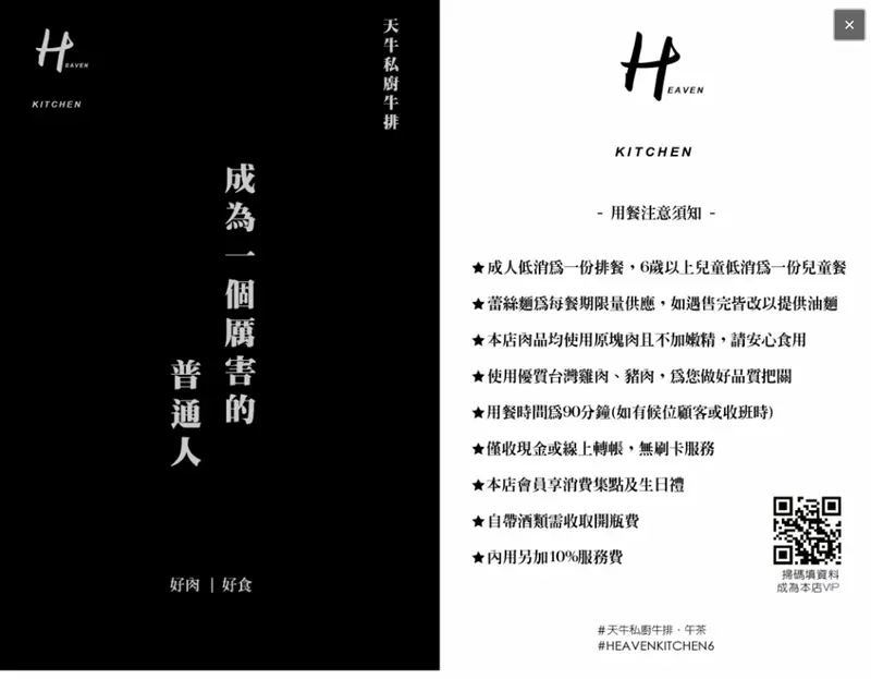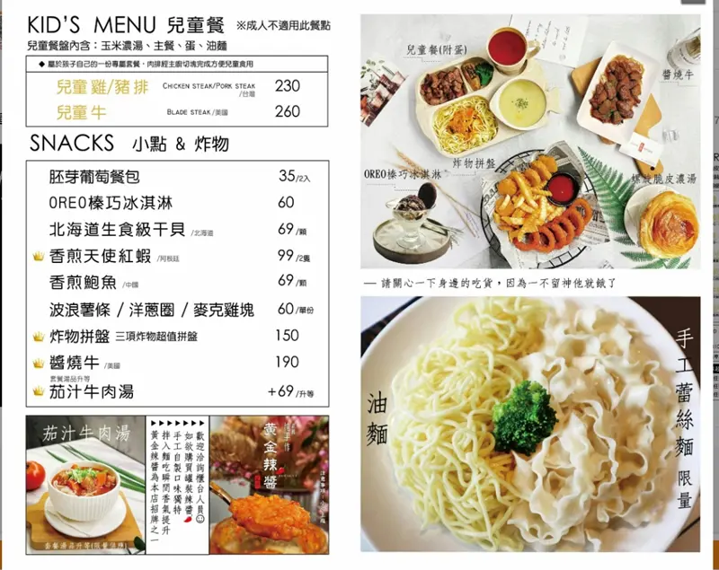 成人低消為一份排餐,6歲以上兒童低消為一份兒童餐