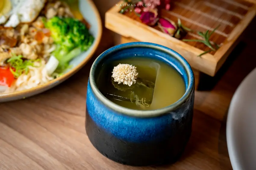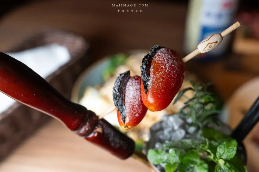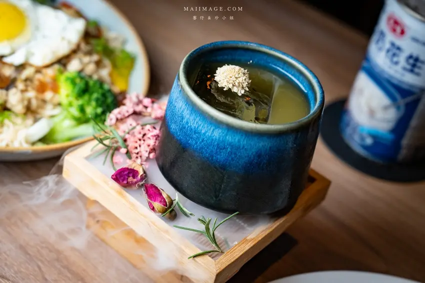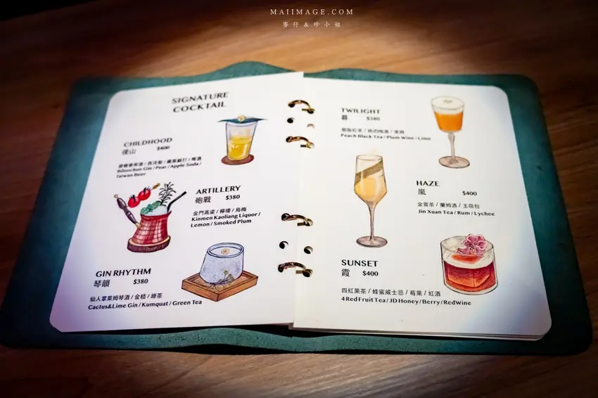 除了懷舊風,這裡的調酒也充滿視覺與味覺的驚喜。「琴韻」一上桌就自帶浮誇的乾冰煙霧秀,選用帶有特殊香氣的仙人掌萊姆琴酒為基底,搭配金桔、綠茶與自製綠茶糖漿,口感清爽酸甜,茶香與萊姆香氣完美融合。另一款「砲戰」則將杯子設計成砲台造型,大膽使用 38 度金門高粱結合烏梅汁,烏梅的煙燻酸甜巧妙中和了高粱的辛辣,意外順口好喝,還附上蜜餞番茄解膩,是非常適合推薦給外國朋友體驗台灣味的特色調酒。