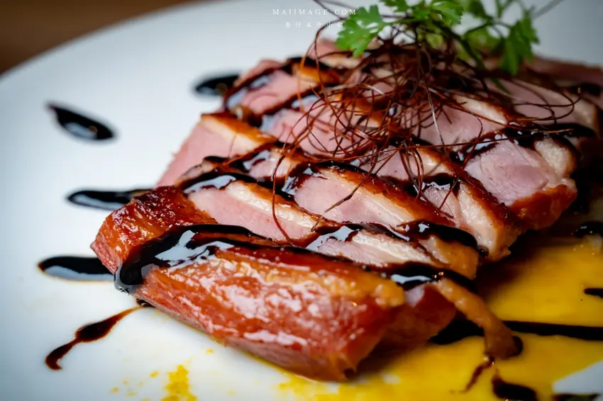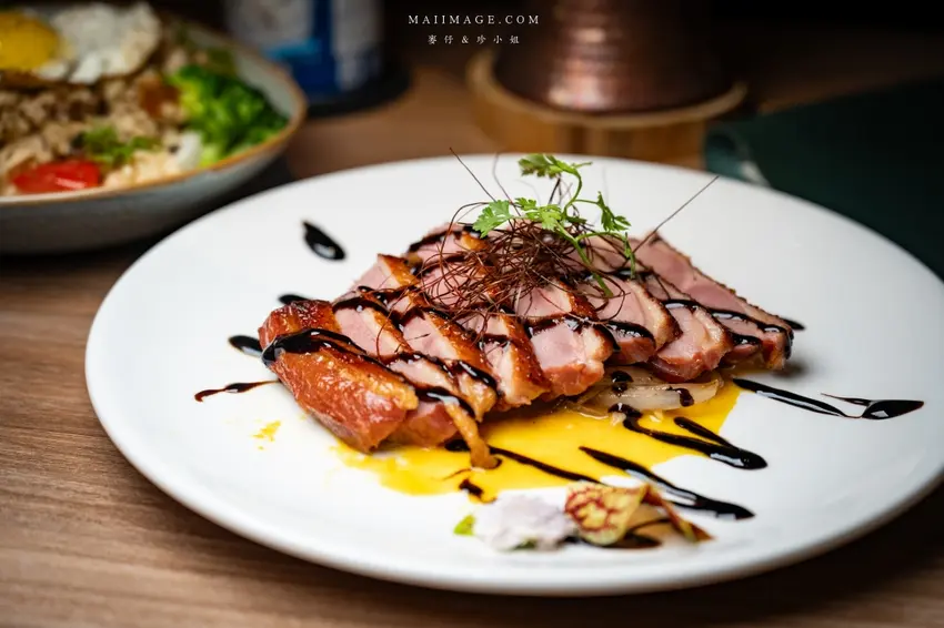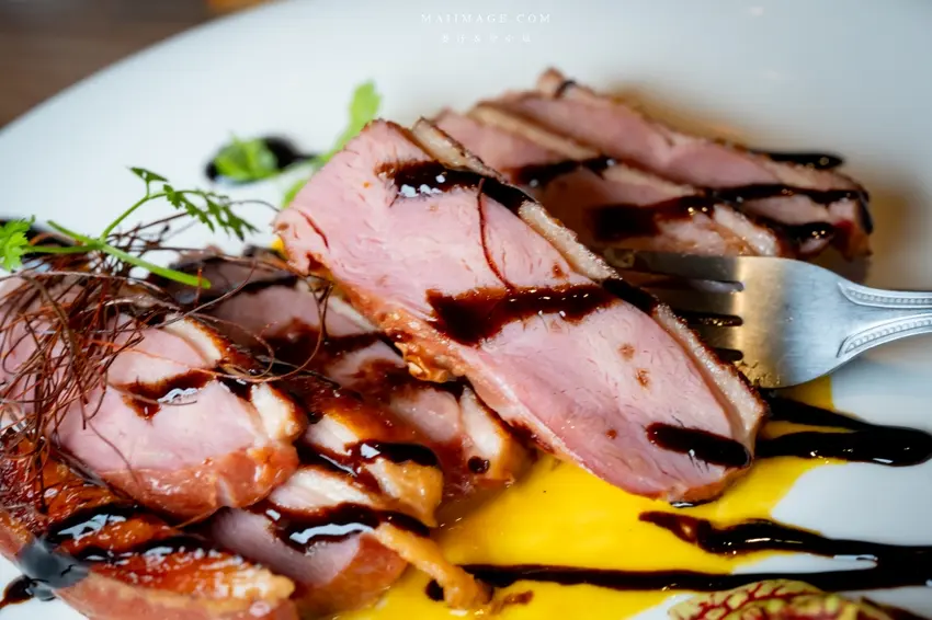 香煎鴨胸軟嫩多汁,紅蘿蔔醬汁添風味