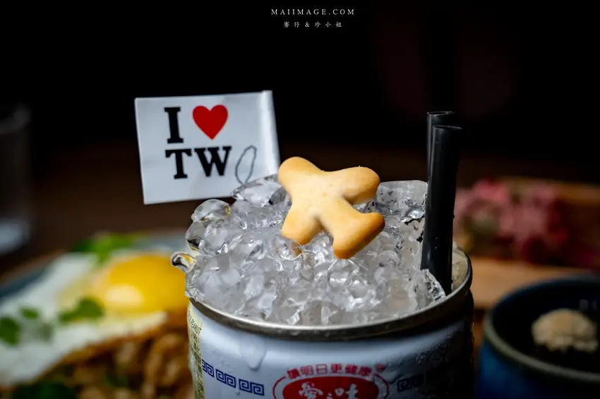 RAY DARTS 的酒單設計別出心裁,以世界各地的特色元素為靈感,其中最具代表性的莫過於以台灣為名的「TAIWAN」調酒。這款由店長花花設計的人氣特調,直接將整杯酒裝在經典的「愛之味牛奶花生」鐵罐中,視覺效果滿分。基底選用威士忌搭配花生牛奶與麥仔茶,酒感輕盈偏甜,喝起來就像在吃小時候的甜湯,搭配上頭的飛機餅乾與「我愛台灣」裝飾,滿滿的童年回憶讓人會心一笑。