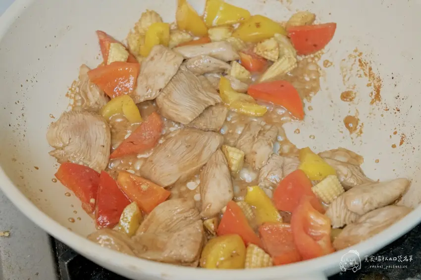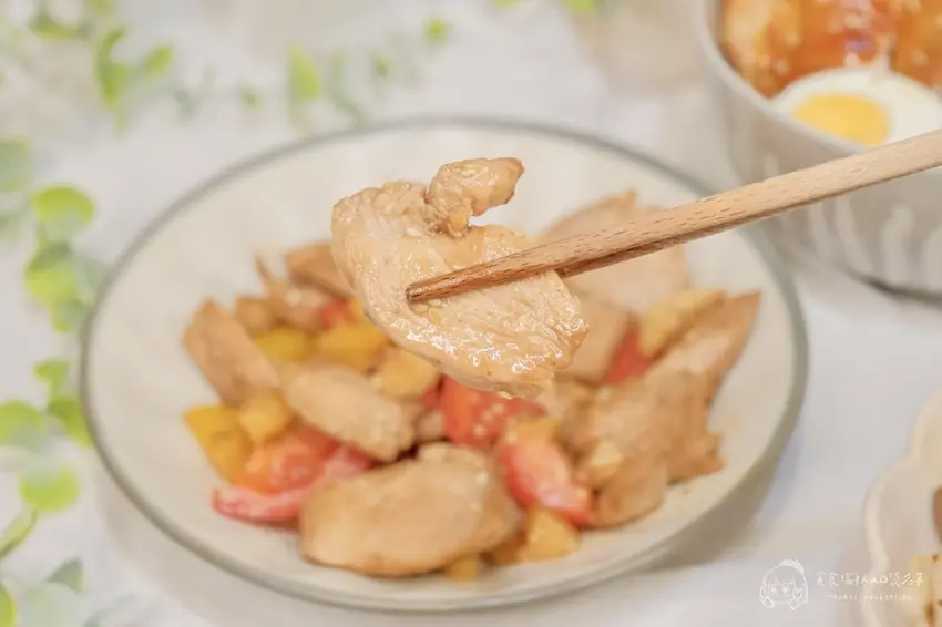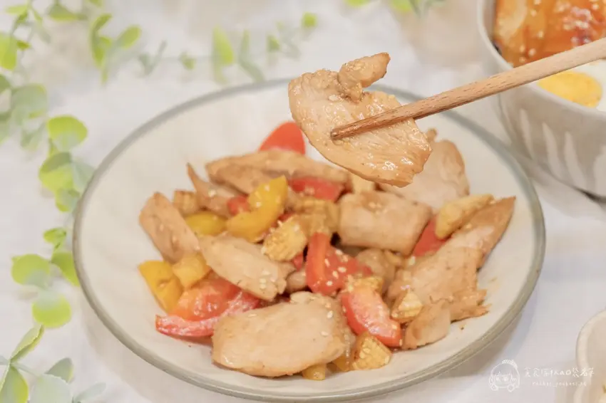 第一道料理使用「清胸肉」製作「醬燒肉片炒時蔬」。許多人擔心雞胸肉容易乾柴,但只要將切片後的雞胸肉加入少許太白粉與燒肉醬抓醃,就能鎖住水分。接著與玉米筍、甜椒等喜好的時蔬一同下鍋拌炒,起鍋前撒上些許白芝麻點綴即可。益活雞的胸肉吸附了醬燒香氣,經過快炒後依然保持極佳的嫩度,吃起來滑嫩好入口,完全顛覆雞胸肉乾澀的印象,是一道營養均衡且高蛋白的美味常備菜。